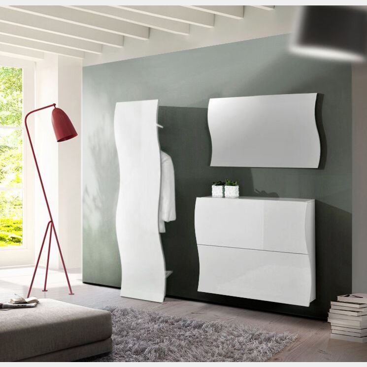 Il mobile d'ingresso dalle linee ondulate è composta da 1 specchiera, 1 appendiabiti e 1 scarpiera a due ante (può contenere fino a 16 paia di scarpe). Sia il guardaroba che la scarpiera sono in finitura bianco laccato lucido. La composizione darà una valore in più alla vostra casa.