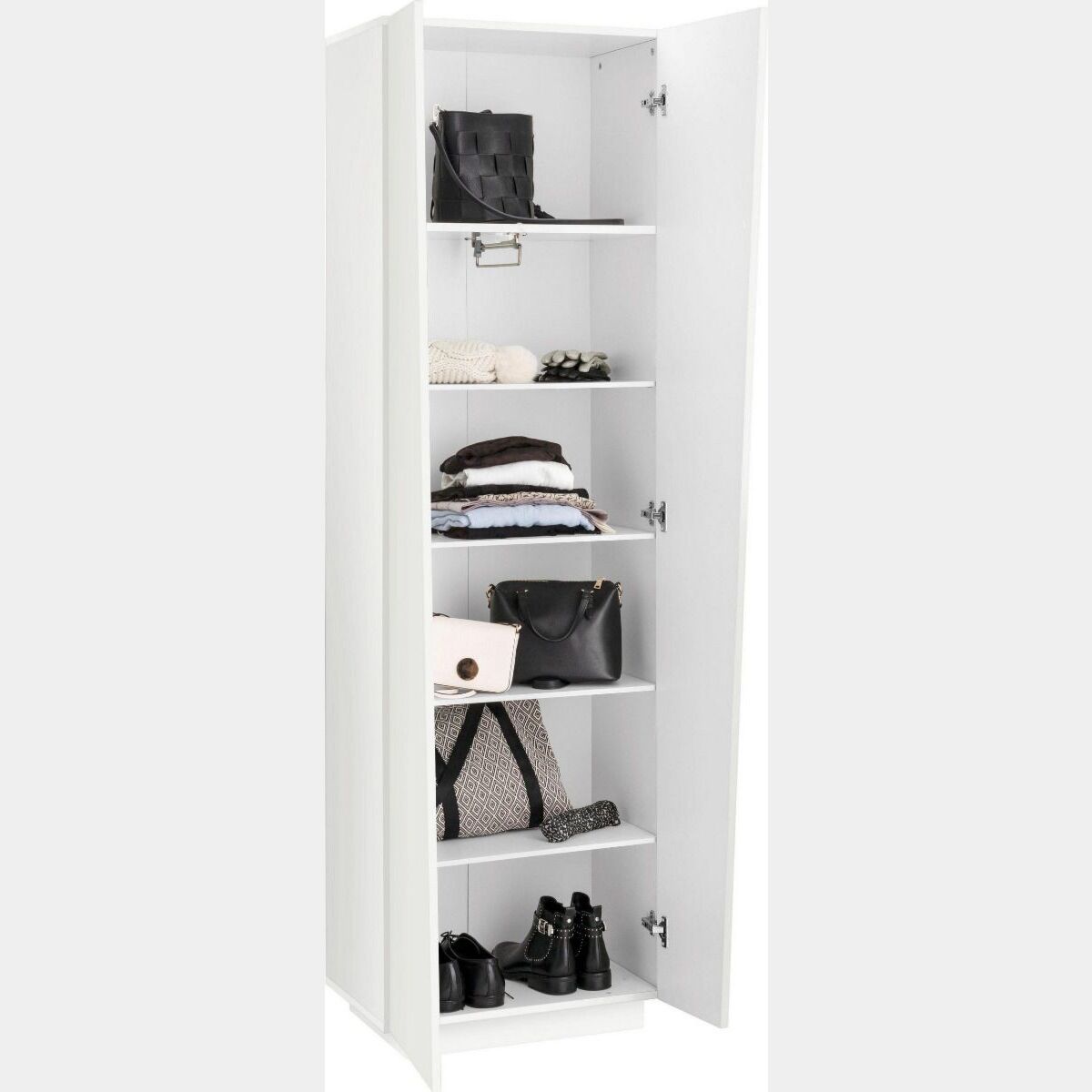 Pratico Armadio 2 ante battenti con struttura e frontali in Bianco Lucido, adatto a camere moderne o di design. Utile anche come armadio destinato al cambio di stagione. L'allestimento comprende 5 ripiani.