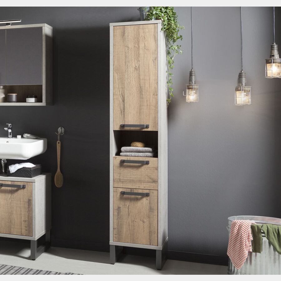 - La colonna è composta da 2 ante, 1 cassetto centrale e un piccolo vano a giorno in finitura rovere invecchiato, la struttura invece è in finitura cemento. Maniglie e piedi sono in finitura antracite. Le cerniere del cassetto sono in metallo.