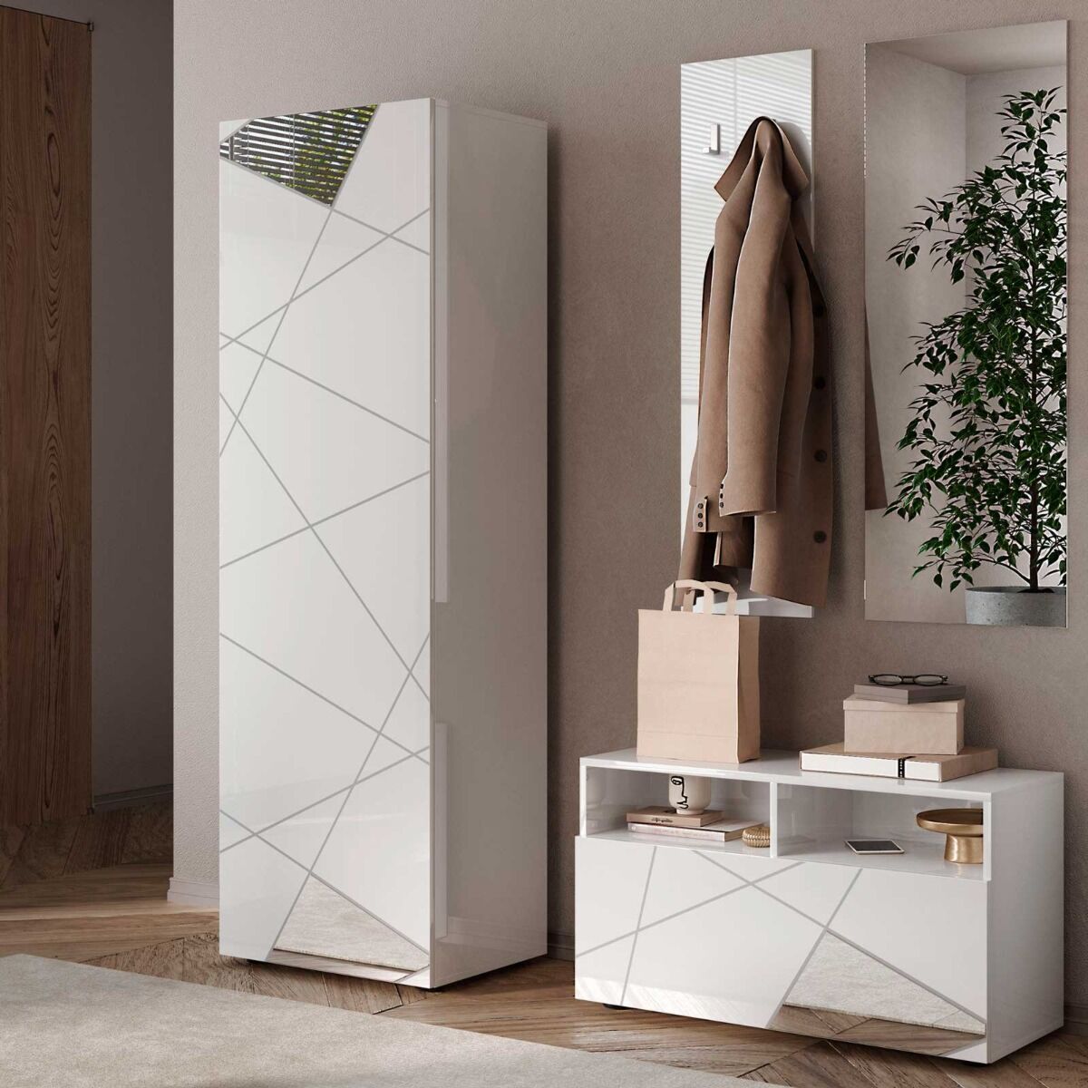 Mobili per ingresso con guardaroba, panca, specchio e appendiabiti, Bianco lucido