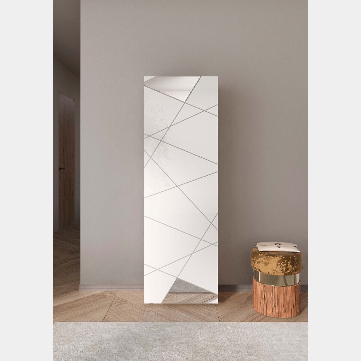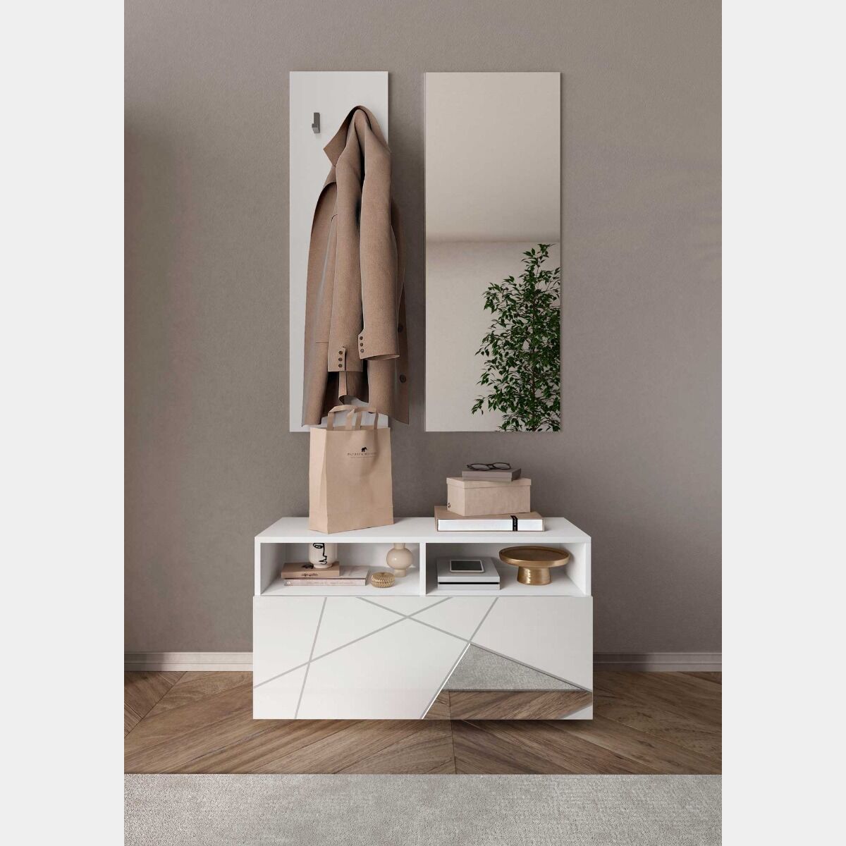 La composizione d'ingresso presenta una caratteristica finitura serigrafata in Bianco lucido con inserti specchio.
