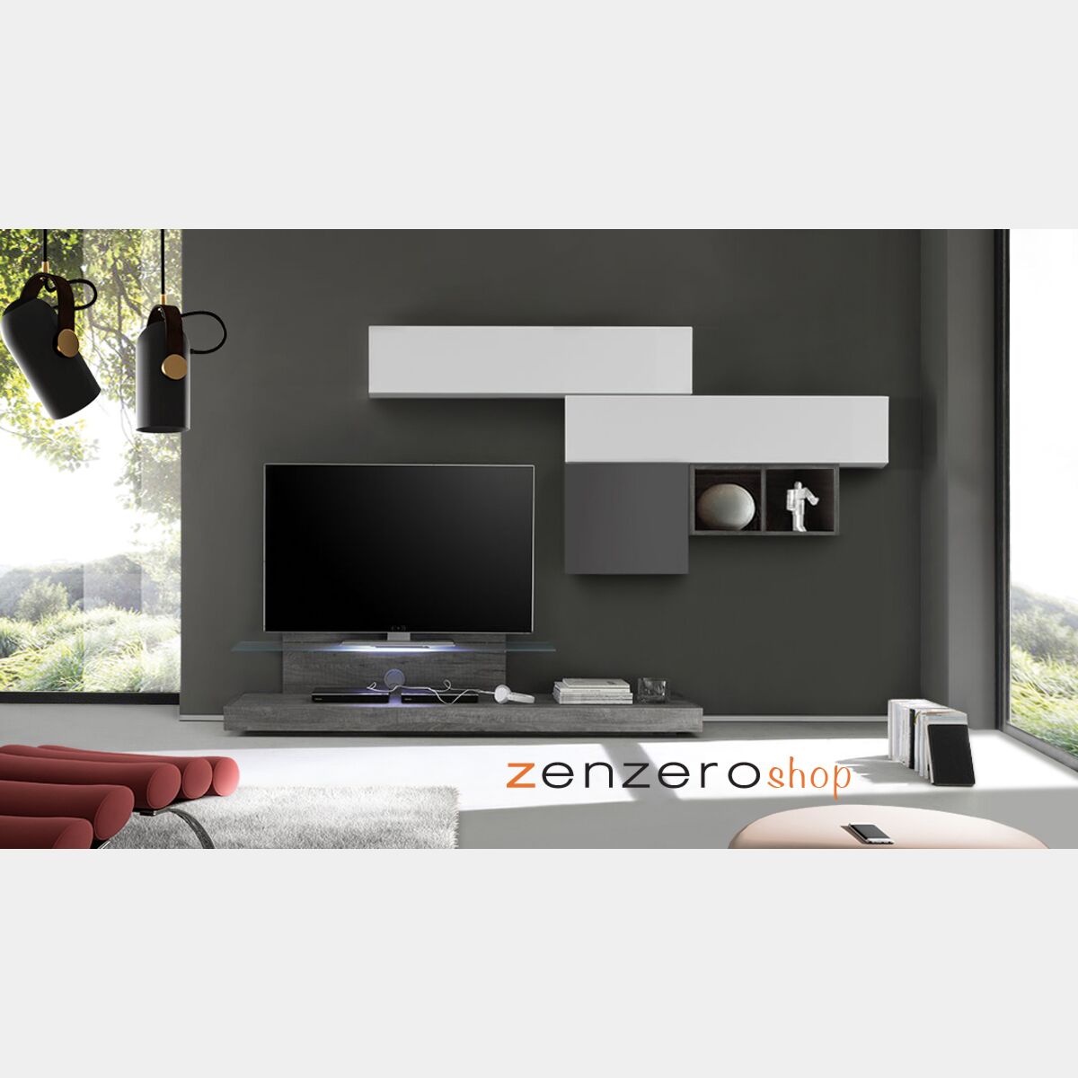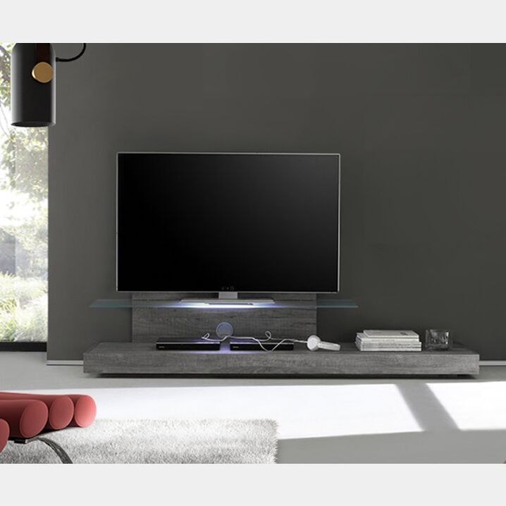 Porta TV dal design moderno e funzionale per un arredamento informale e di sicuro impatto. Questa linea di prodotti si distingue per la grande versatilità sia nei colori che nelle composizioni proposte riuscendo cosi a soddisfare ogni esigenza della nostra clientela. La base tv è completamente nella finitura Rovere Grigio ed ha una mensola in vetro resistente e un foro passacavi per tenere ordinato il piano.