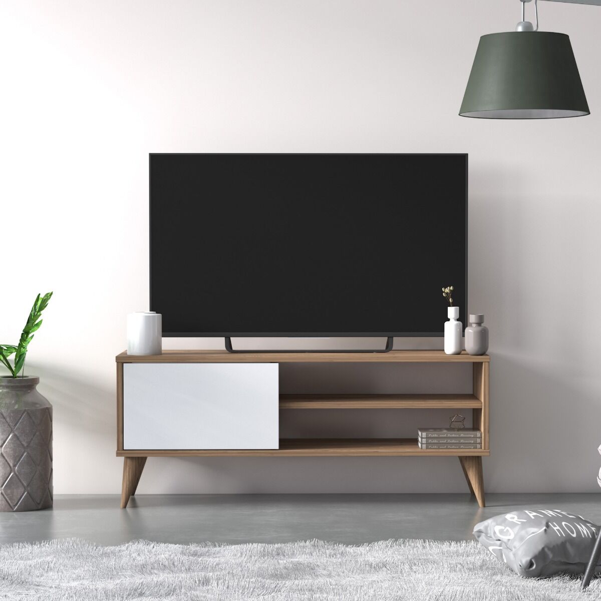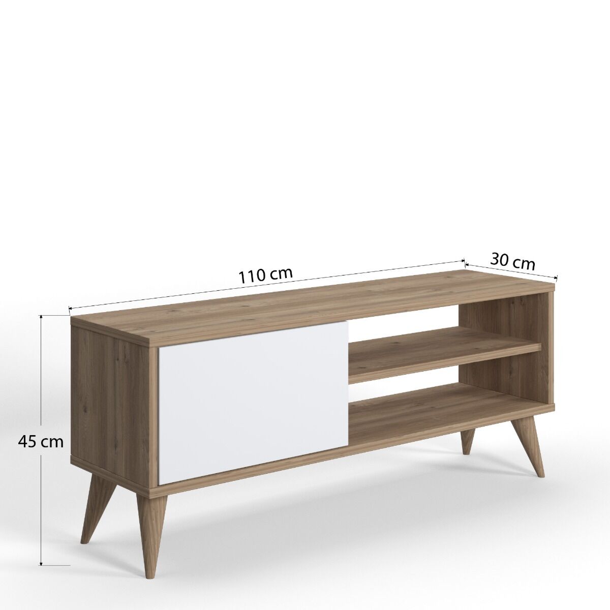 Il porta tv è formato da un'anta sulla sinistra e un ripiano sulla destra che crea 2 spazi di appoggio. Grazie alle sue dimensioni risulta poco ingombrante e molto pratico.