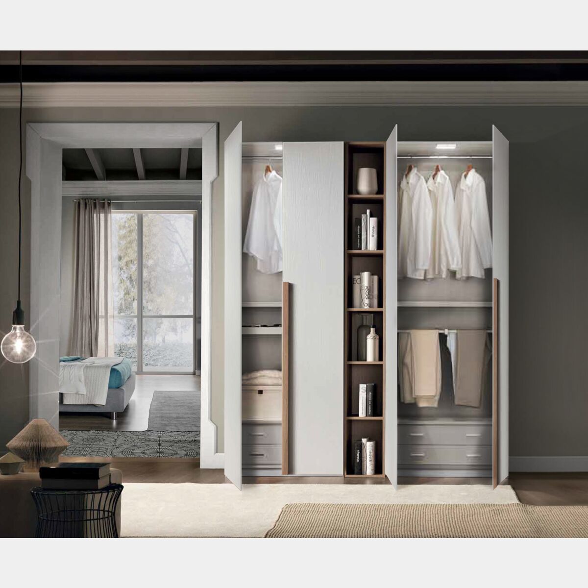 L'armadio è composto da 4 ante battenti unite da una libreria centrale a 5 ripiani. La finitura di quest'ultimo elemento riprende le maniglie (H.130 cm) e crea un'atmosfera unica.