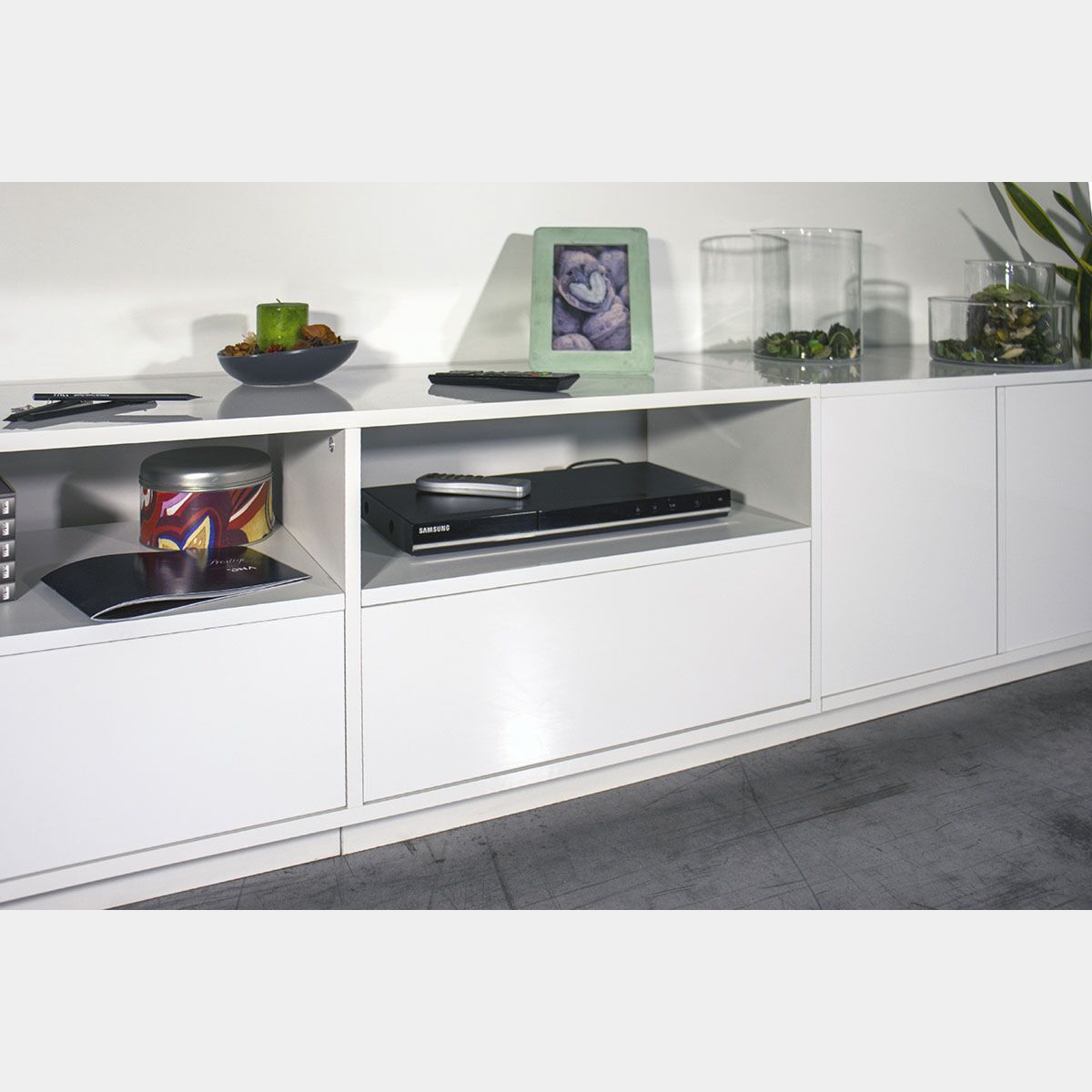 L'unicità di questo porta tv di design è la raffinatezza delle ante frontali in bianco laccato lucido per rimarcarne l'aspetto contemporaneo e moderno, le quali rimangono incastrate all’interno della profondità del mobile contribuendo alla creatività che caratterizza la collezione, merito anche delle linee semplici che la compongono contribuiscono anche la creatività senza limiti
