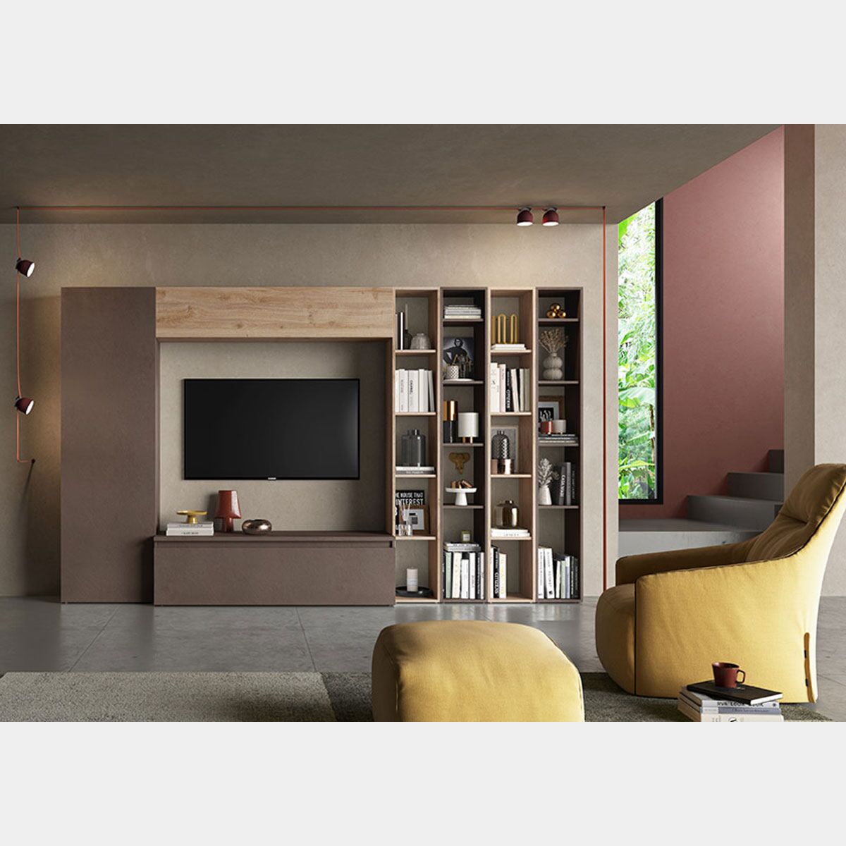 E' composta da un mobile TV cassettone, una spaziosa libreria composta da 4 colonne, 1 pensile a vasistas/ribalta appeso e un'ampia colonna ad un'anta battente.