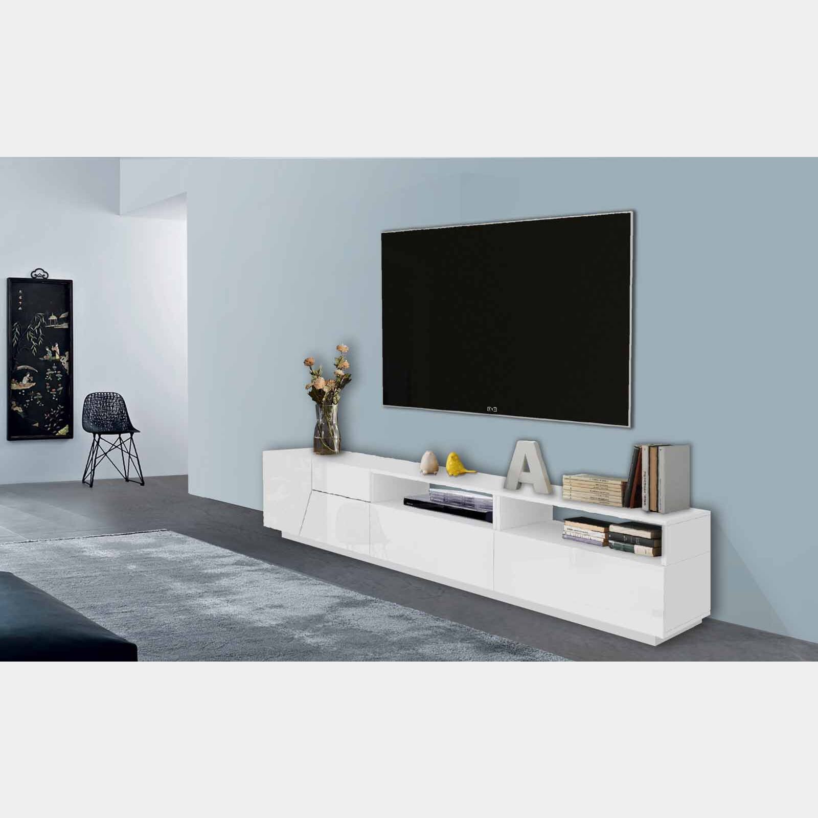 Il porta TV è valorizzato dalla finitura bianco lucido, brillante e di effetto.