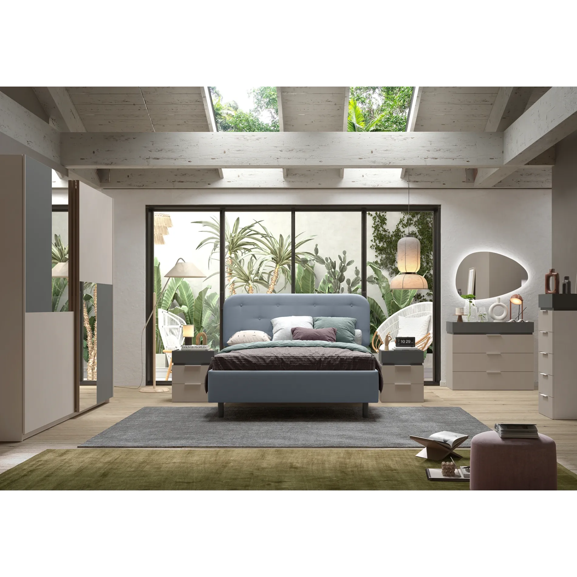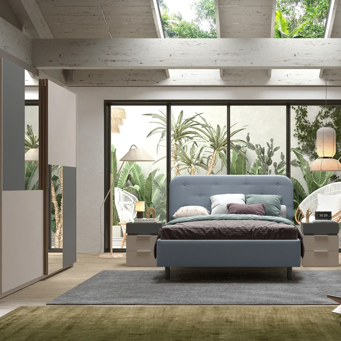 Camera da letto moderna con armadio scorrevole, letto in tessuto e coppia di comodini, finitura Cashmere e Antracite. Scopri tutta la collezione Mondo!