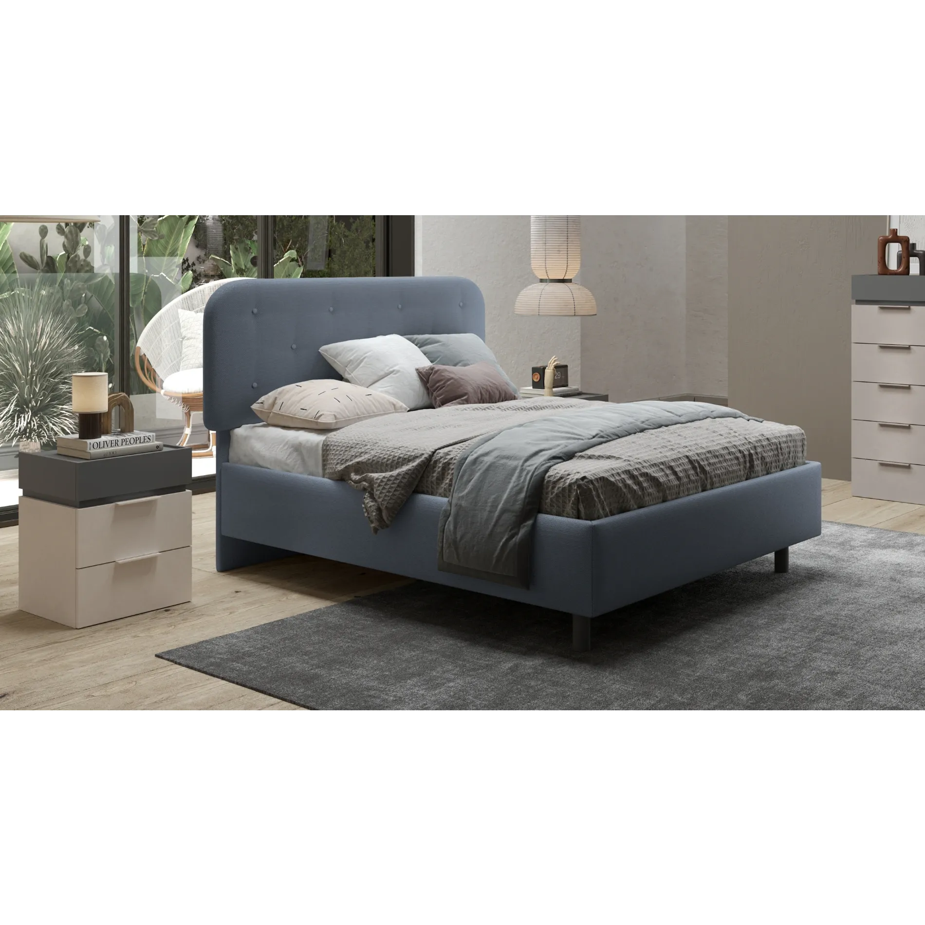 Il letto viene proposto in tessuto Azzurro polvere, tinta pastello che ben si accosta alle finiture di armadio e comodini.