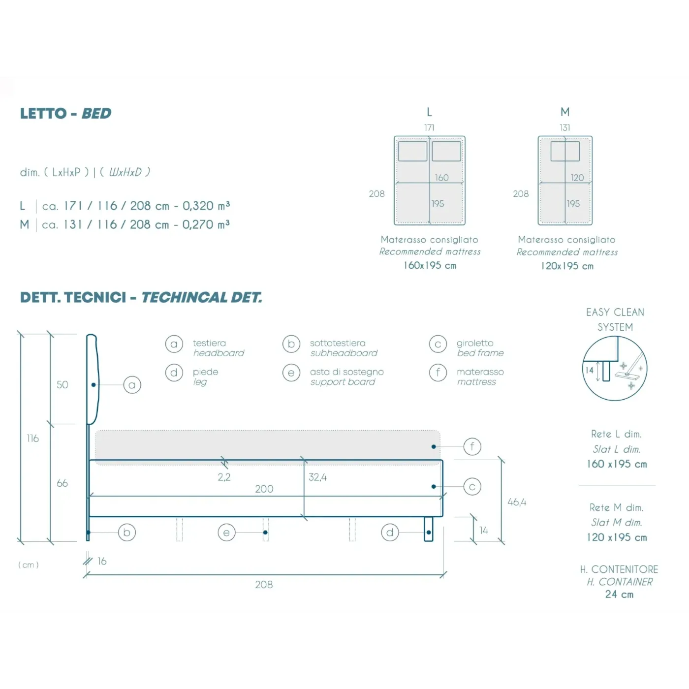 Il letto supporta rete e materasso (non inclusi) dimensioni 160x195.