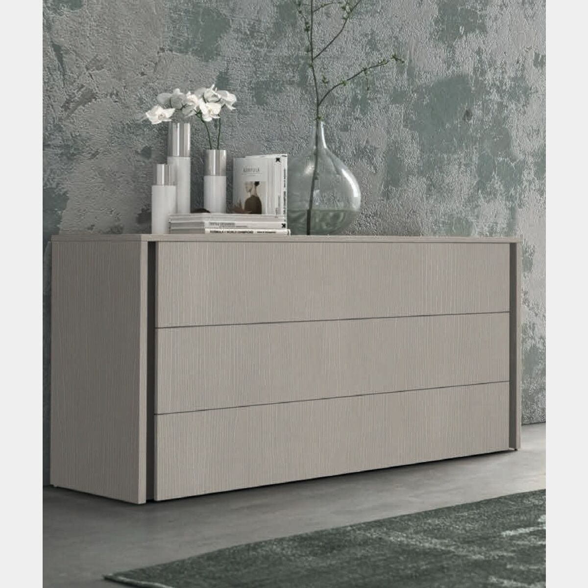 Il comò presenta 3 capienti cassetti alti 24 cm dotati di sistema di chiusura rallentata e piedini sono regolabili. La finitura proposta è Rovere dorian: finitura materica di grande tendenza. Grazie alla sua versatilità si adatta a più stili. L'effetto delle venature più chiare poste verticalmente ne esalta il design per offrire una soluzione che, oltre a risultare pratica, diventa protagonista della camera da letto.