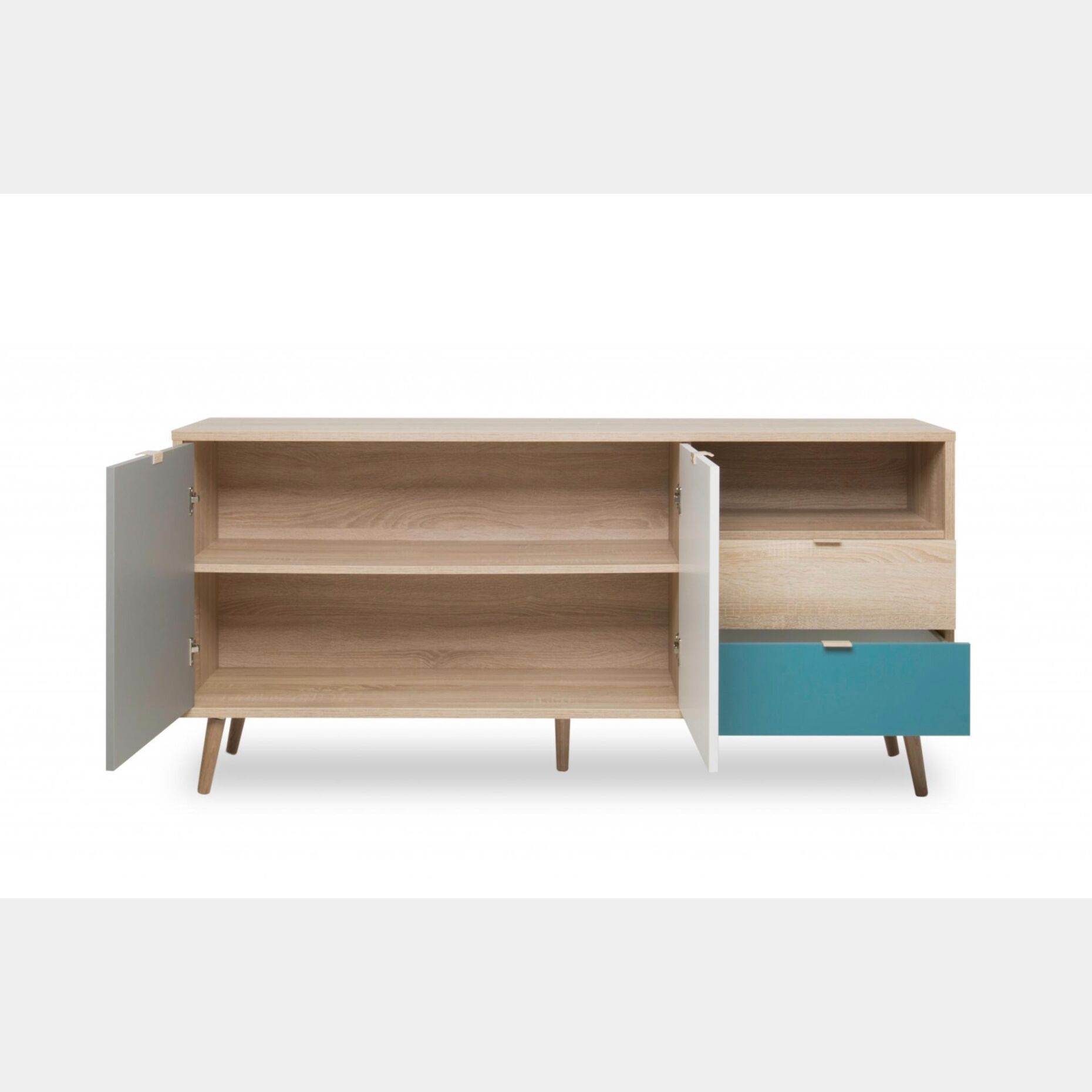 Offerta Madia Lavik con gambe in legno, 2 ante 2 cassetti, finitura Quercia, Bianca, Petrolio e Grigia