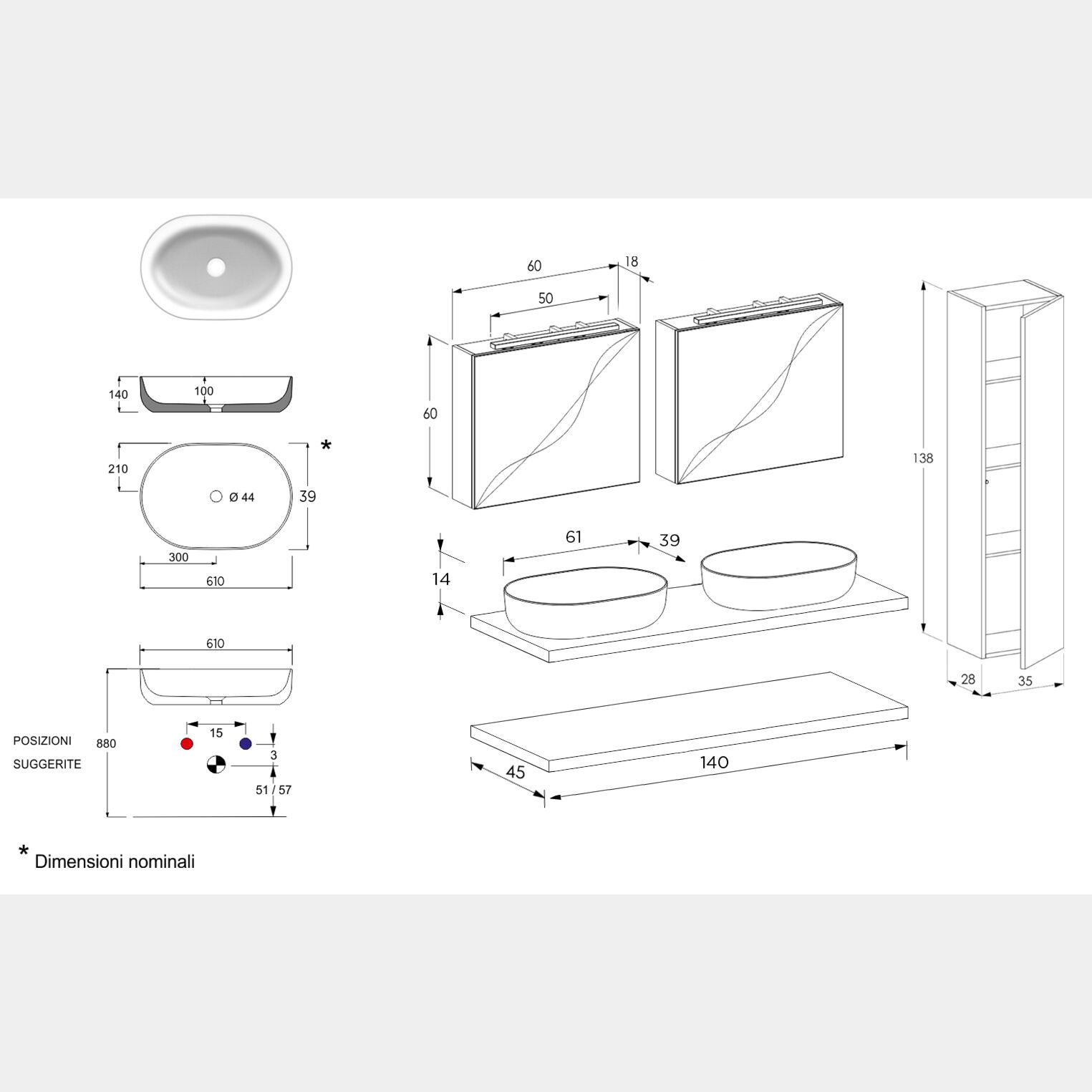 - Lavabo in ceramica: L.61 H.14 P.39 cm (optional)