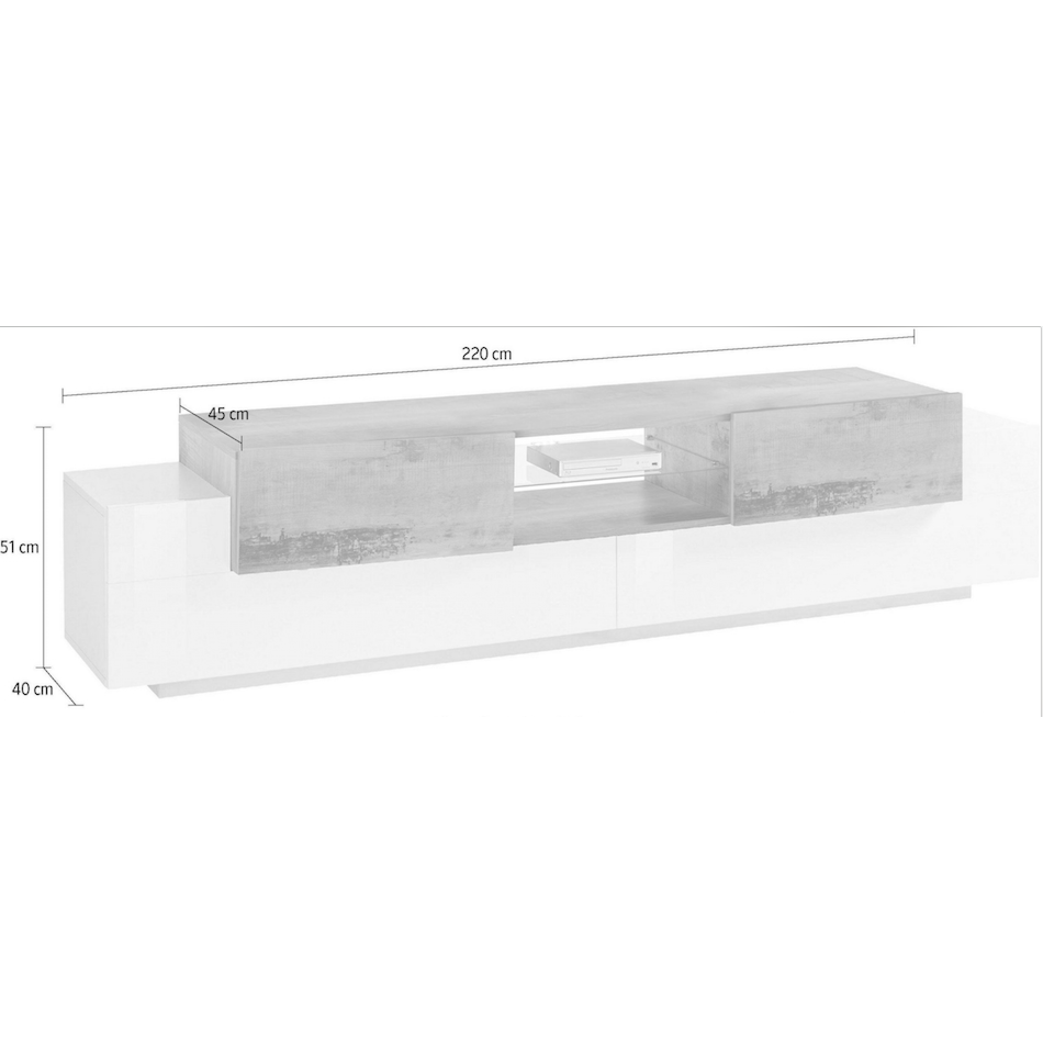 Il porta tv è rifinito in Bianco lucido e Ardesia, la contrapposizione di queste finiture genera un prodotto di grande impatto visivo che diventerà protagonista del tuo soggiorno.