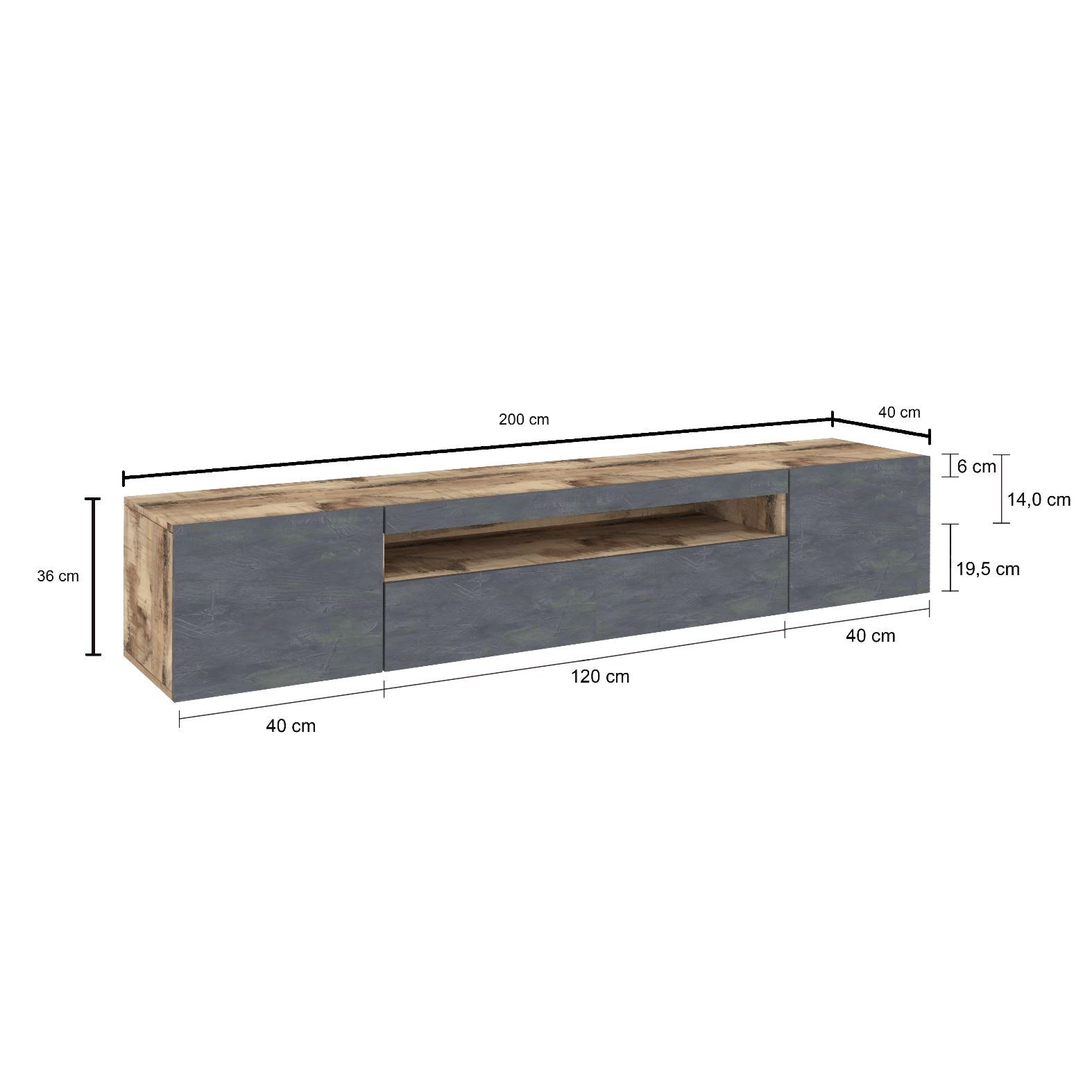 La finitura in Pero presente nei frontali ha sfumature più scure che richiamano l'Ardesia della struttura e dell'interno. Il mobile tv è composto da 2 ante e una ribalta centrale, è previsto un vano tv utilizzabile come appoggio per lettori DVD e altri accessori per la televisione.