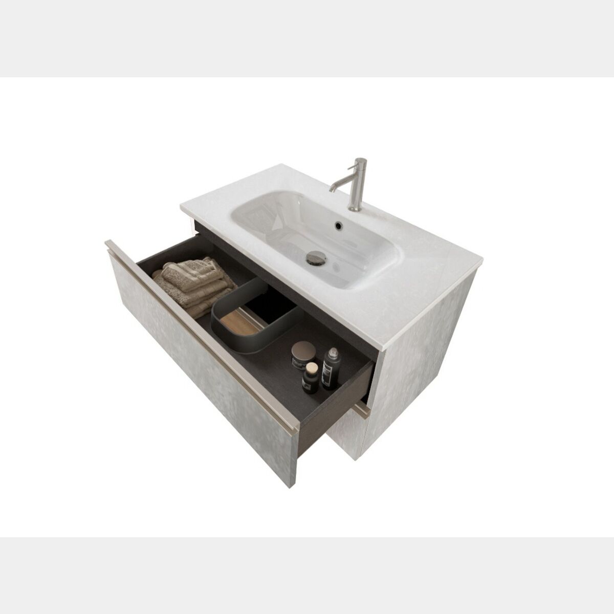 Il mobile da bagno è realizzato con pannelli in agglomerato di legno con superfice in lamina melaminica in finitura Grigio Caldo, è dotato di 2 cassetti con guide di scorrimento metalliche e apertura e chiusura ammortizzata ad estrazione totale, sono in regolabili alto/basso. Le maniglie a “C” sono in metallo nella finitura Nichel Satinato.