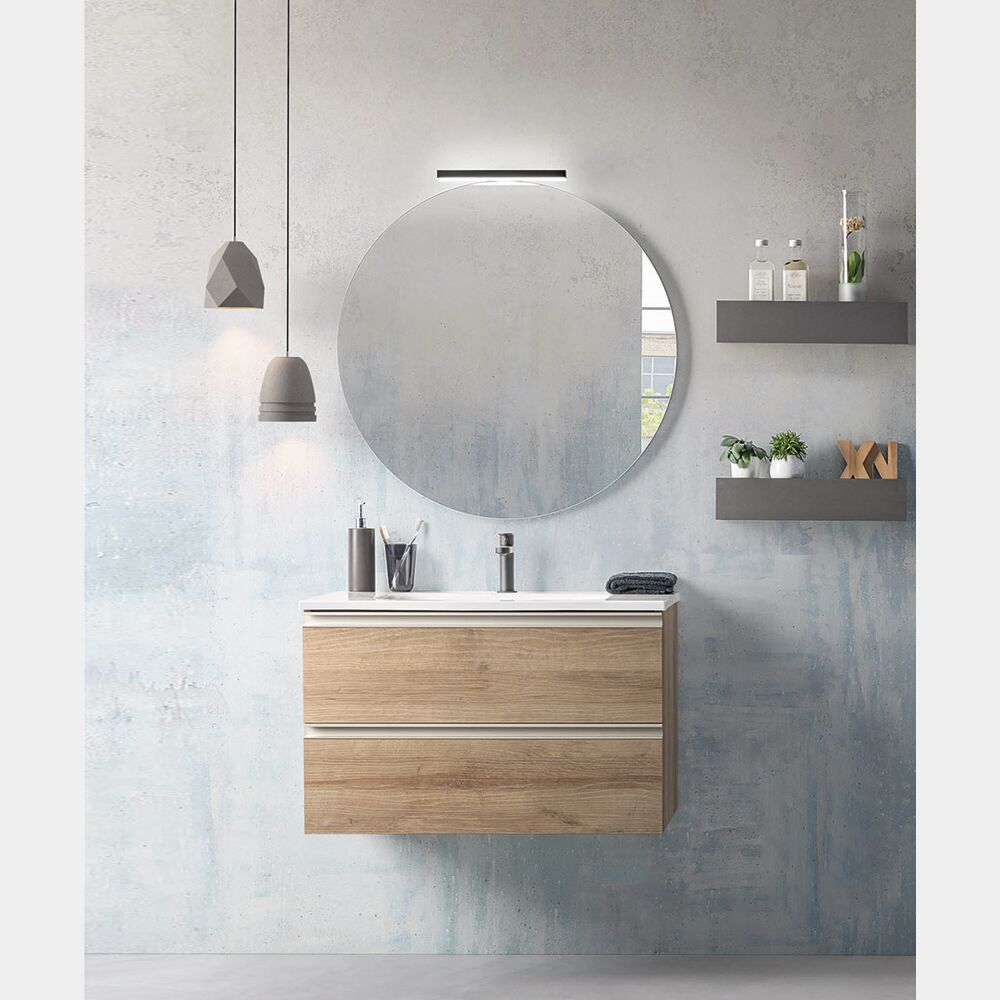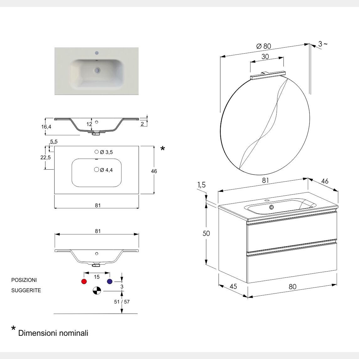 La consolle viene fornita con il lavabo integrato in solid surface, in finitura bianco lucido con troppopieno e foro miscelatore, lo specchio tondo supportato su pannello struttura in agglomerato di particelle di legno con lamina melaminica e la lampada con illuminazione LED a basso consumo di energia, IP 44 sono optional.