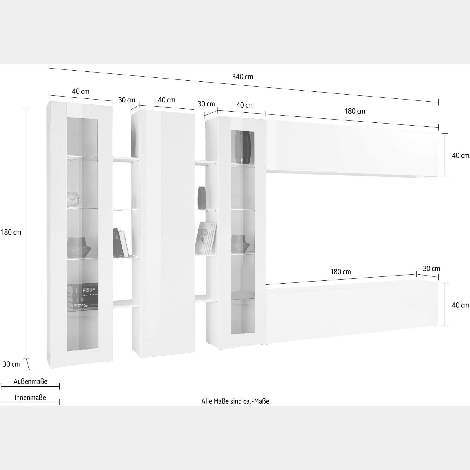 La parete attrezzata è composta da un mobile base utilizzabile come porta TV con anta a ribalta e due vani separati all'interno. A questo si aggiunge un pensile sospeso, 2 vetrine e una colonna armadio tenuti insieme da una serie di ripiani che creano una splendida libreria a vista.