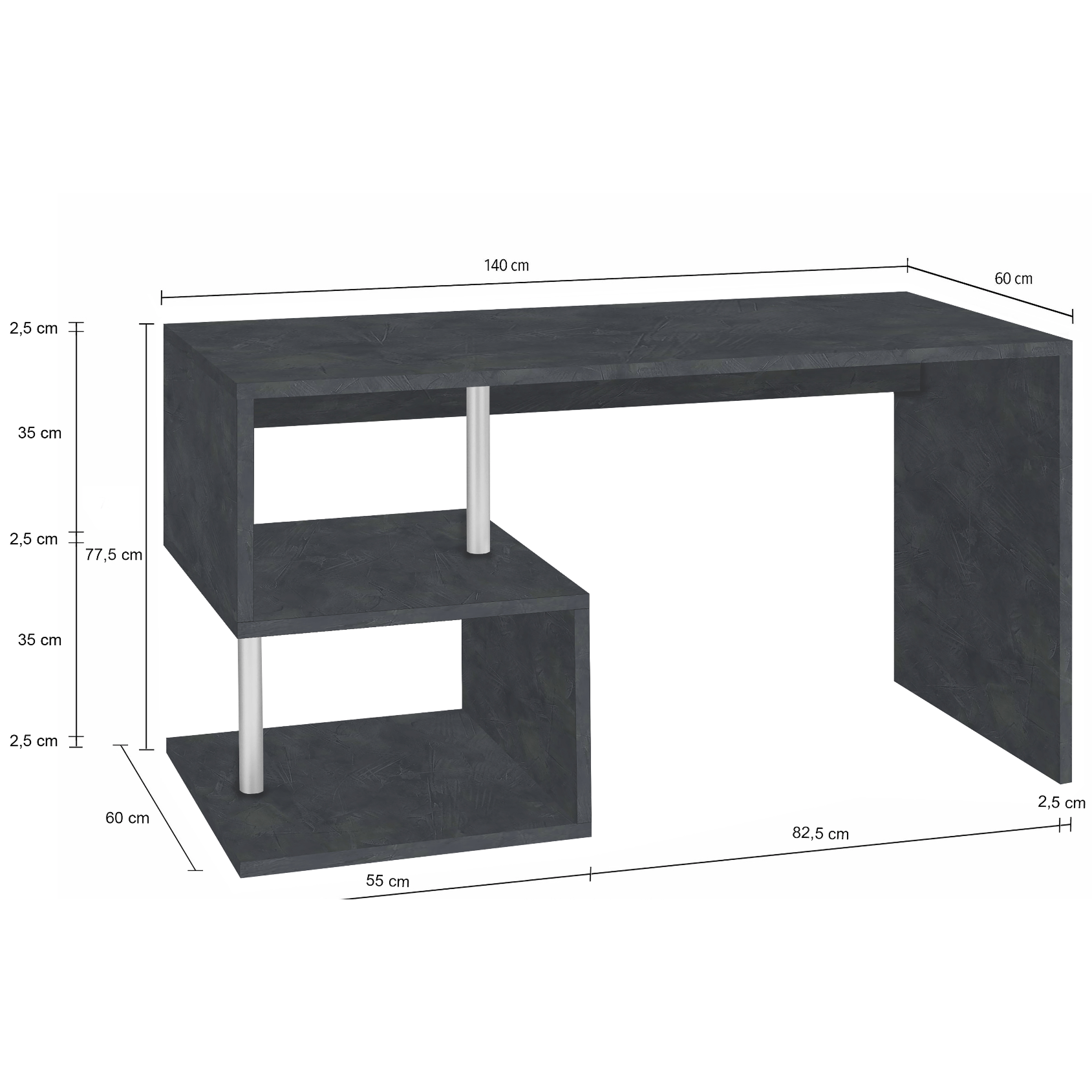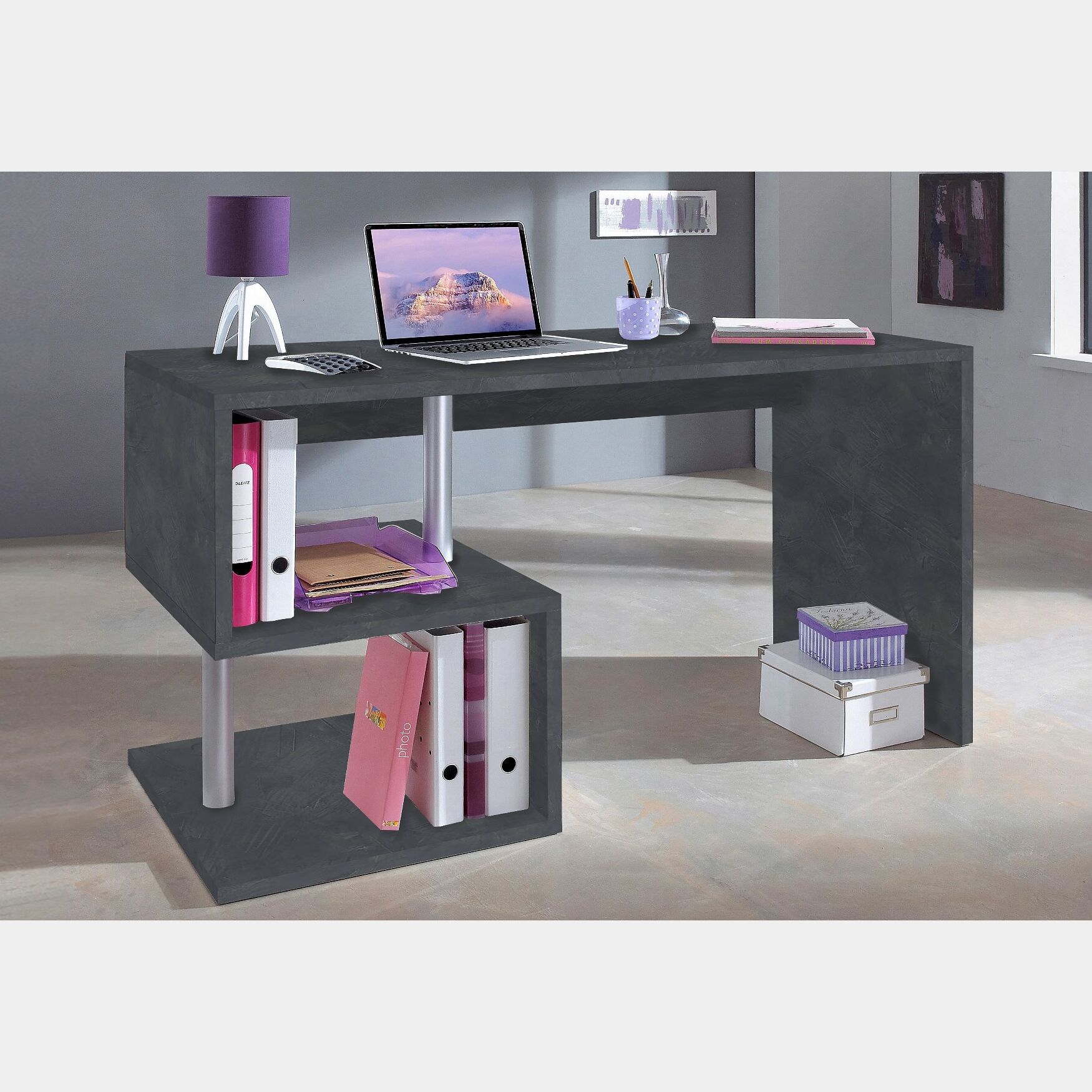 La finitura Ardesia presenta sfumature irregolari che consentono alla scrivania di risultare unica e moderna. La scrivania è disponibile inoltre nelle dimensioni di L.100 e L.140 oppure ad angolo, anche in Bianco lucido.