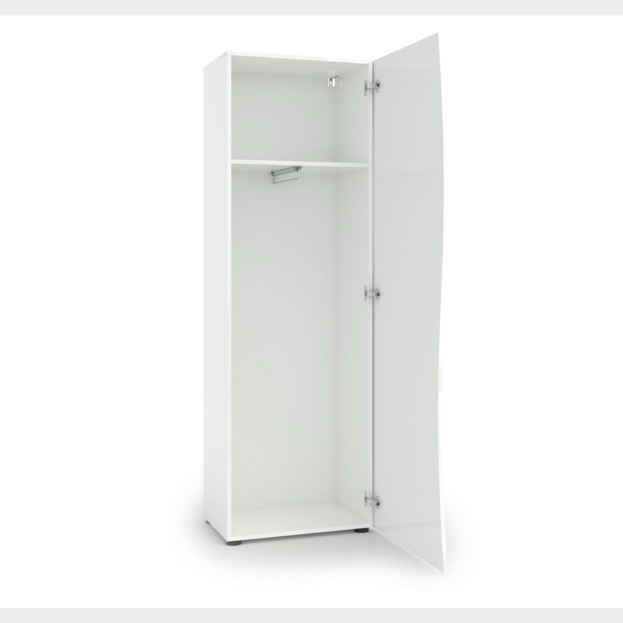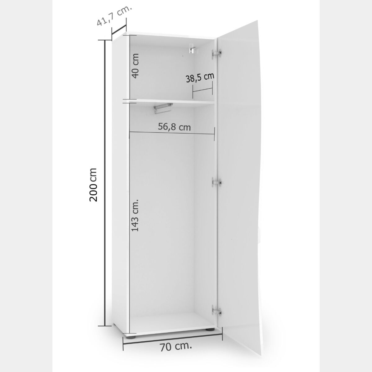 E' dotato di un'anta, un ripiano in alto e un tubo appendiabiti.