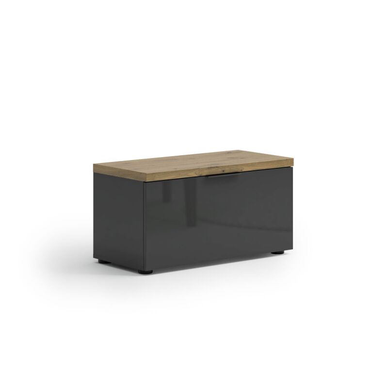 Scarpiera moderna in finitura Antracite lucido con piano Rovere miele, semplice e dalle linee minimal, questa panca interpreta al meglio la zona living.