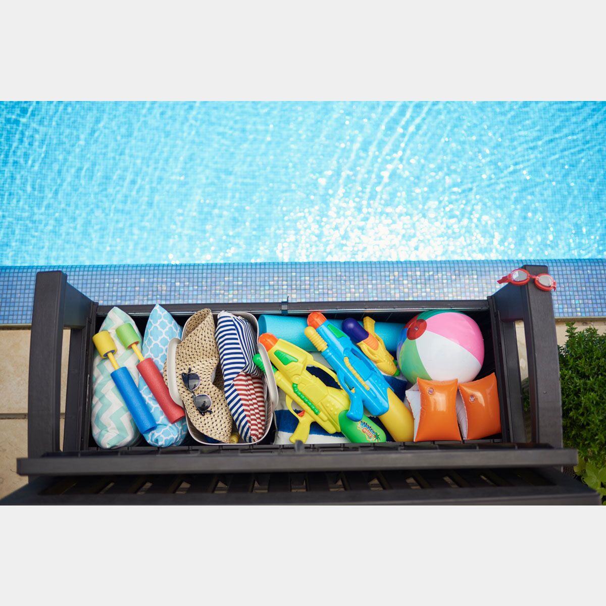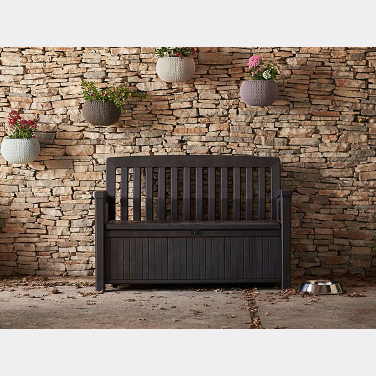 La panchina da esterni con contenitore è realizzata con resina in finitura Grafite