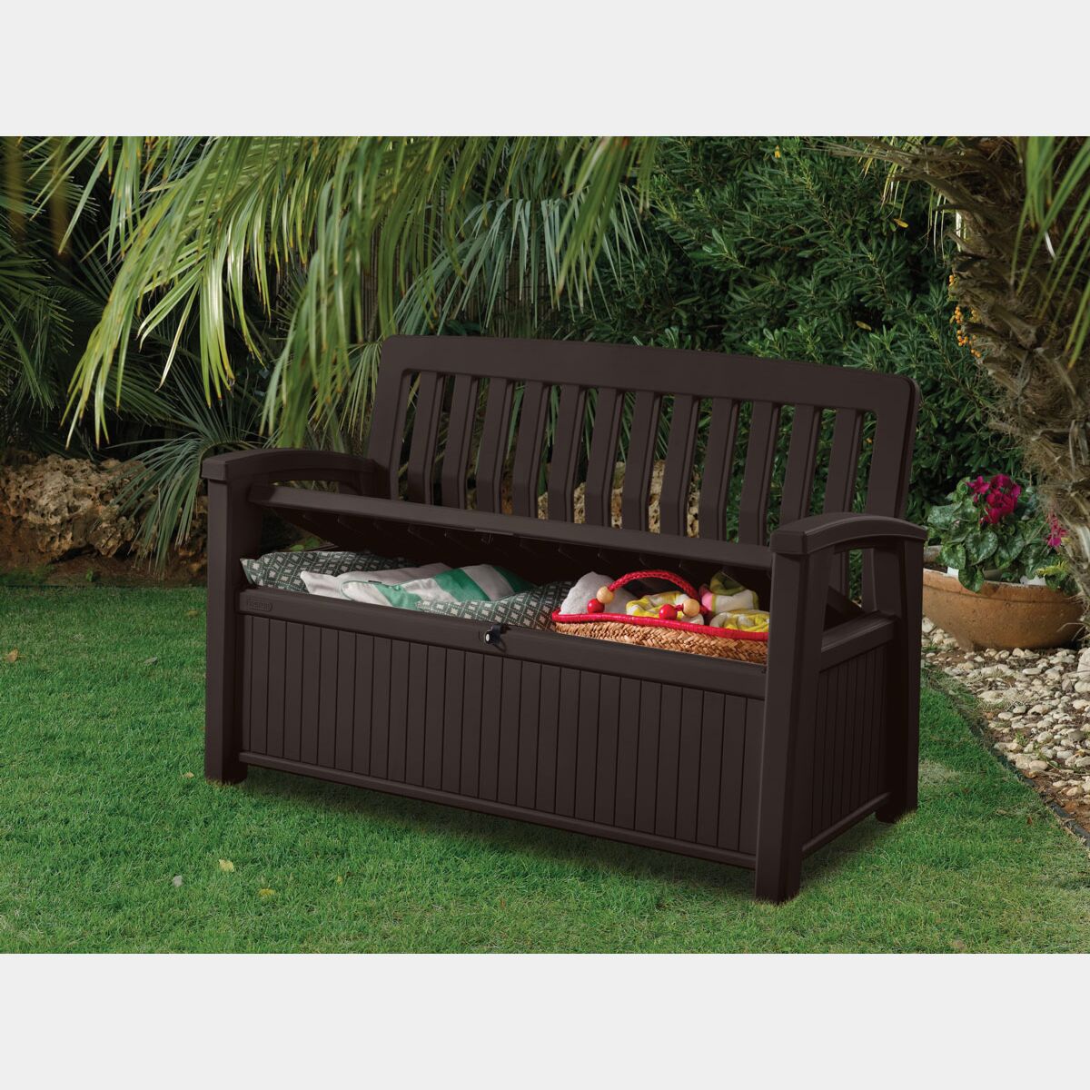 La panchina Abete è un'aggiunta pratica e funzionale al tuo giardino, fornendo una comoda seduta per due persone e un vano contenitore con 227 litri di capacità ideale per contenere attrezzi da giardino e cuscini. Realizzata con resina durevole resistente agli agenti atmosferici, non richiede manutenzione ed è semplice da utilizzare.