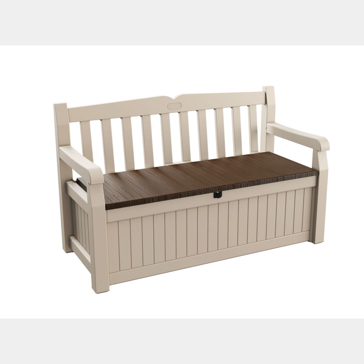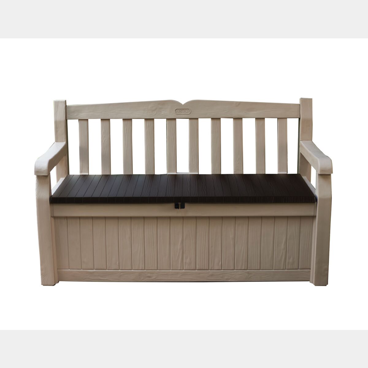 La panchina da esterni con contenitore è in finitura Beige con seduta Marrone.