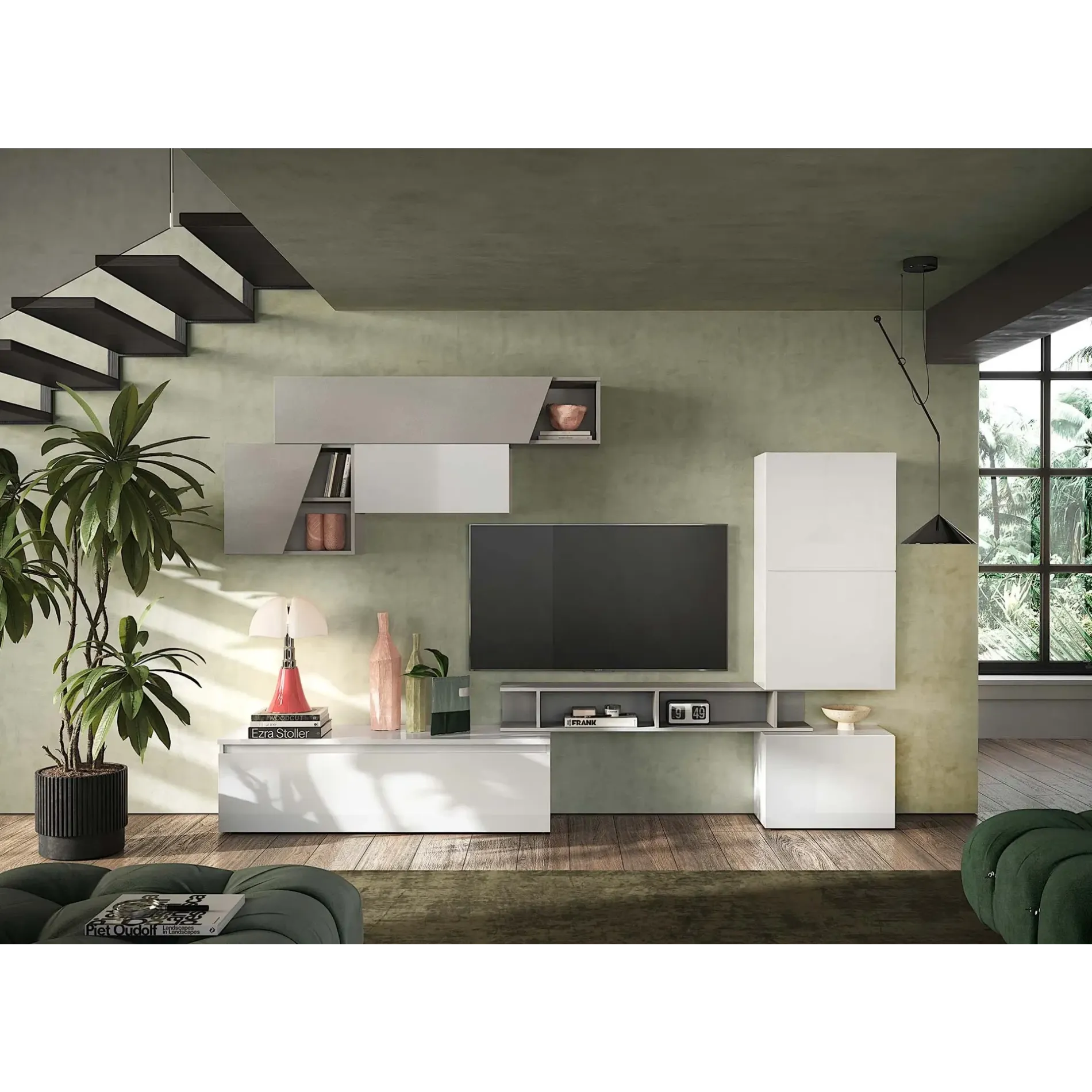Parete attrezzata dal design moderno in finitura Gesso e Bianco lucido, composizone libera. Aggiungi altri elementi al tuo soggiorno oppure vedi tutta la collezione Logica.