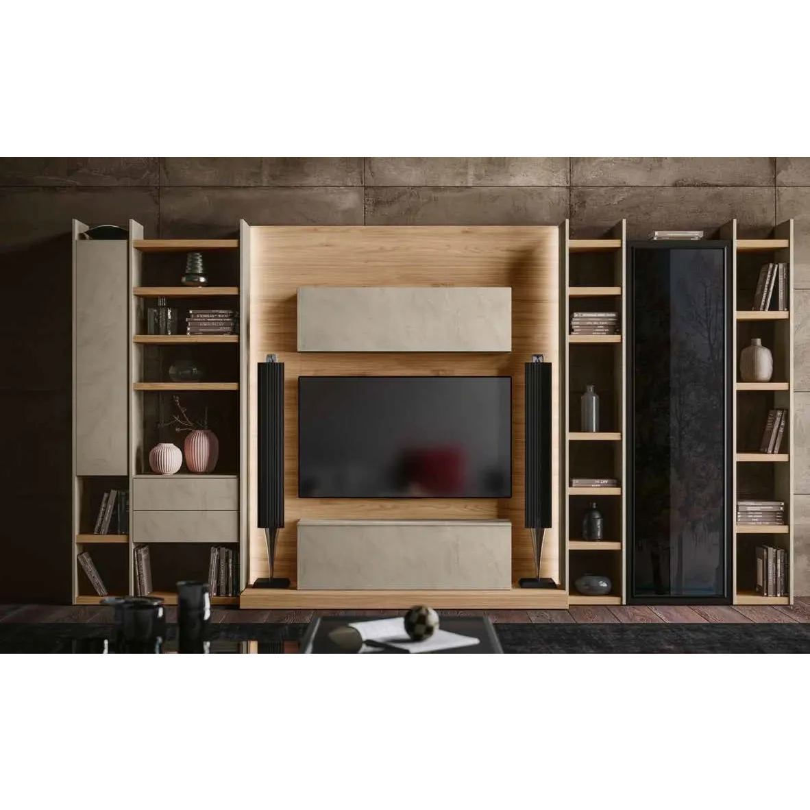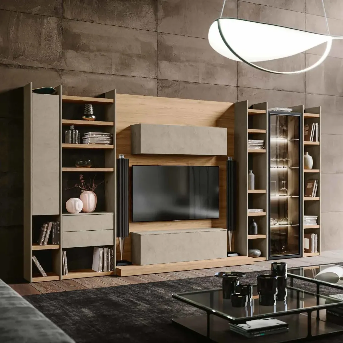 Parete attrezzata a terra con vetrina, Argilla e Noce biondo