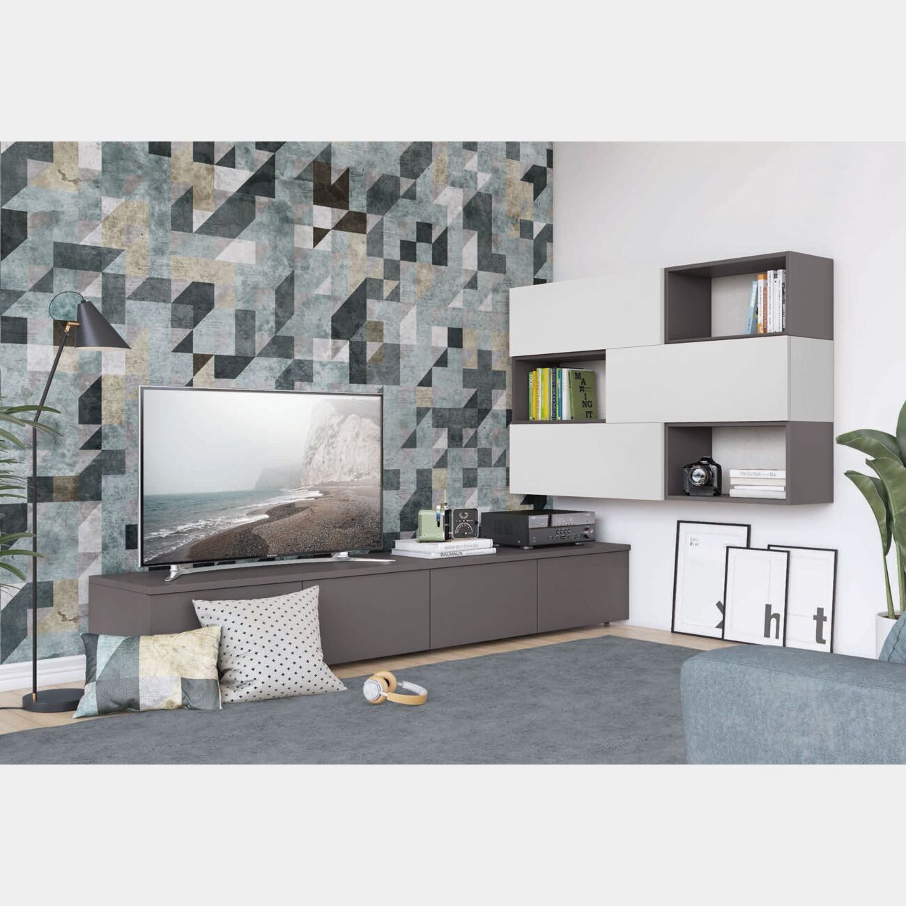 Parete attrezzata ad angolo con base TV e pensili con vani a giorno, titanio e bianco opaco