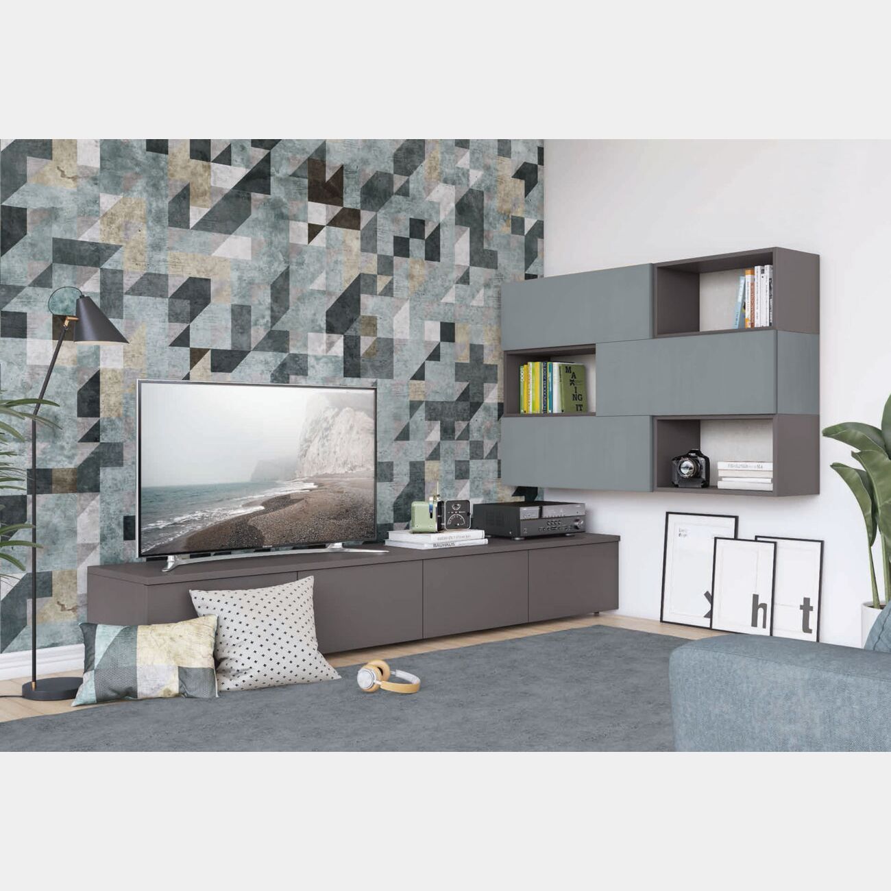 Nello specifico: L'intera composizione è composta da 7 pensili con apertura push-pull e 3 vani a giorno Il top della base tv è un pannello unico