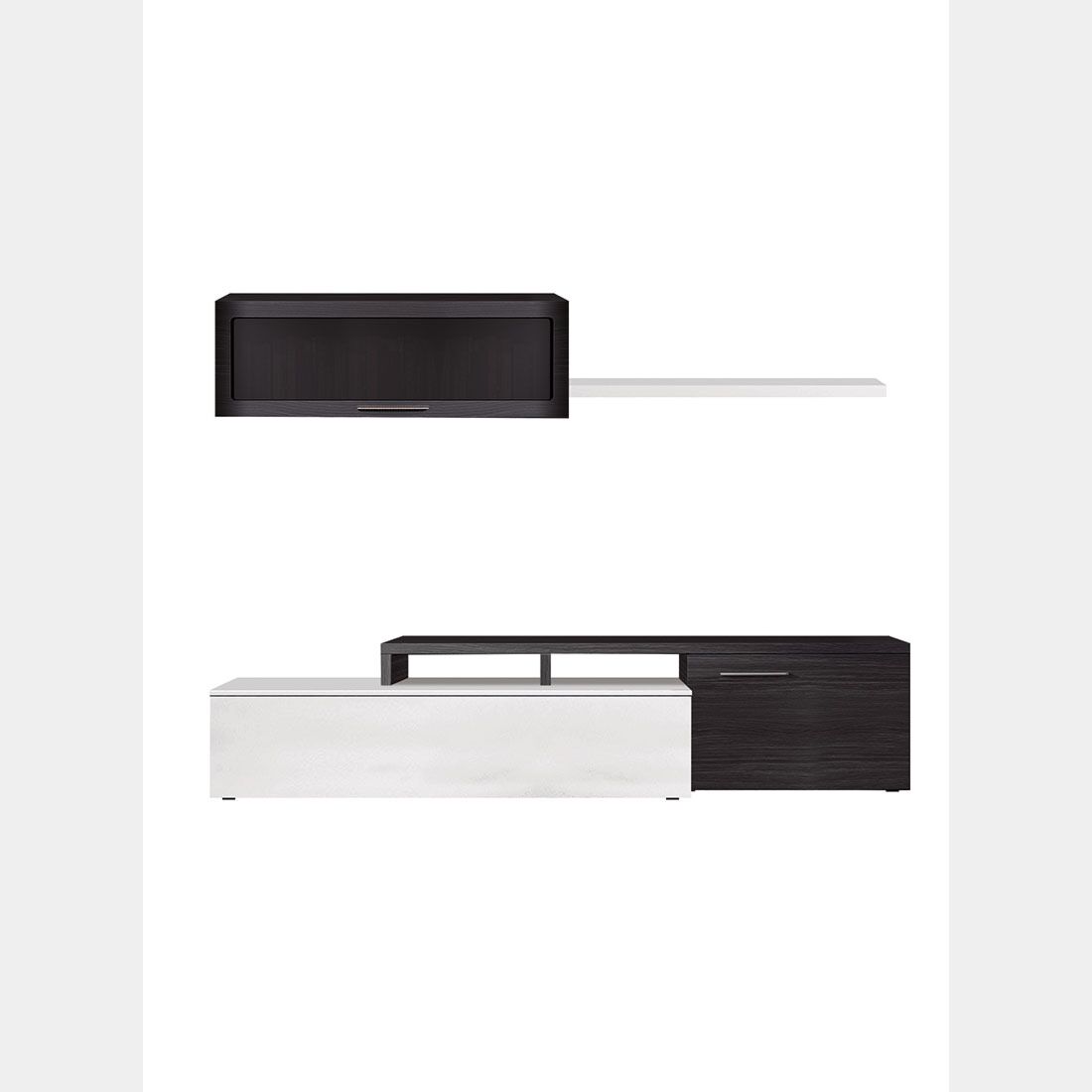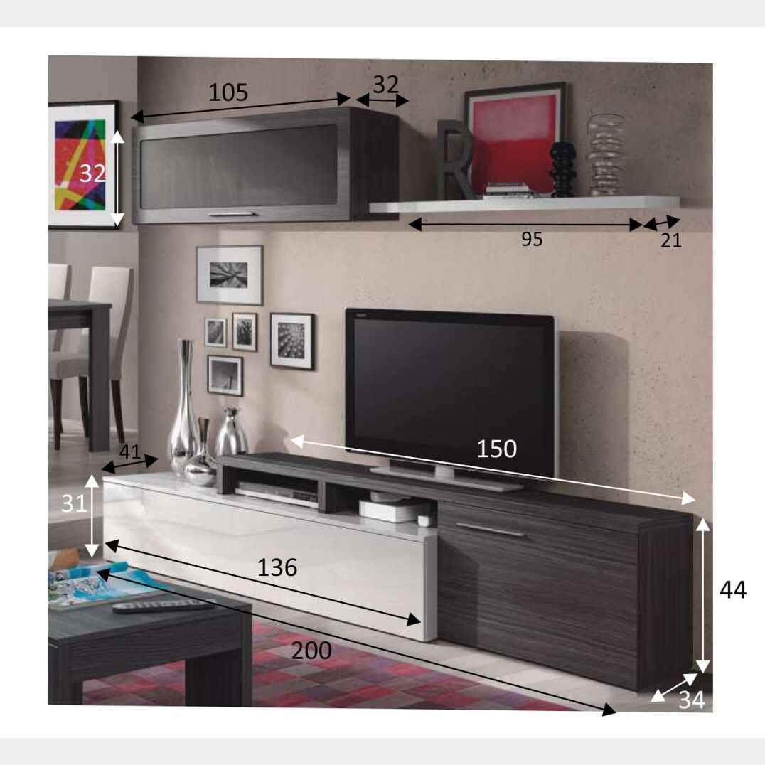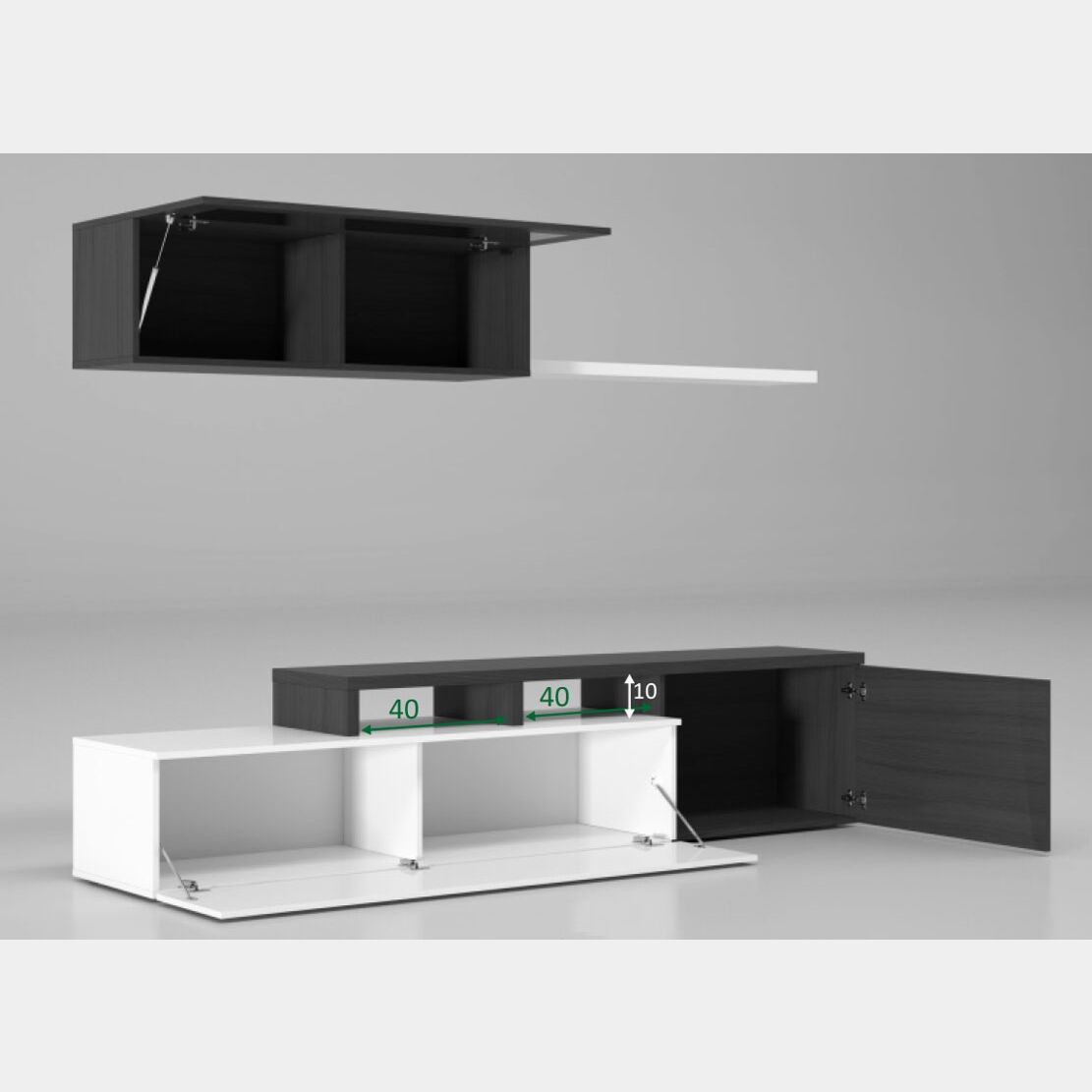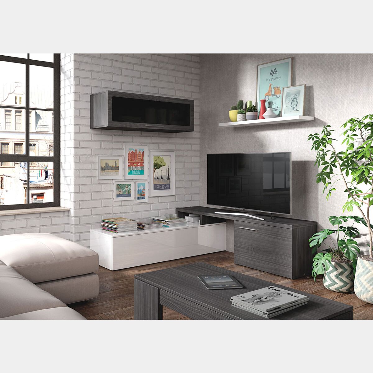 La parete attrezzata angolare è formata da una base porta tv ad angolo, composta da una ribalta bianca lucida con apertura push-pull e un mobile ad un anta battente in finitura grigio cenere.