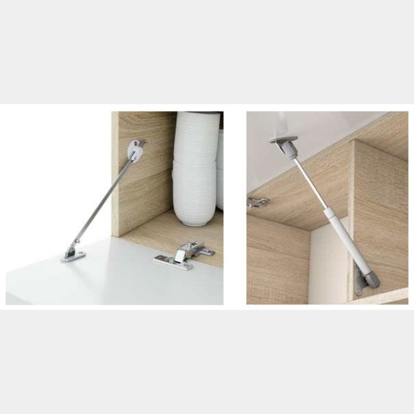 Appeso al muro invece c'è una mensola bianca e un pensile con apertura vasistas. La struttura del pensile è grigio cenere mentre il frontale ha una vetro grigio scuro.