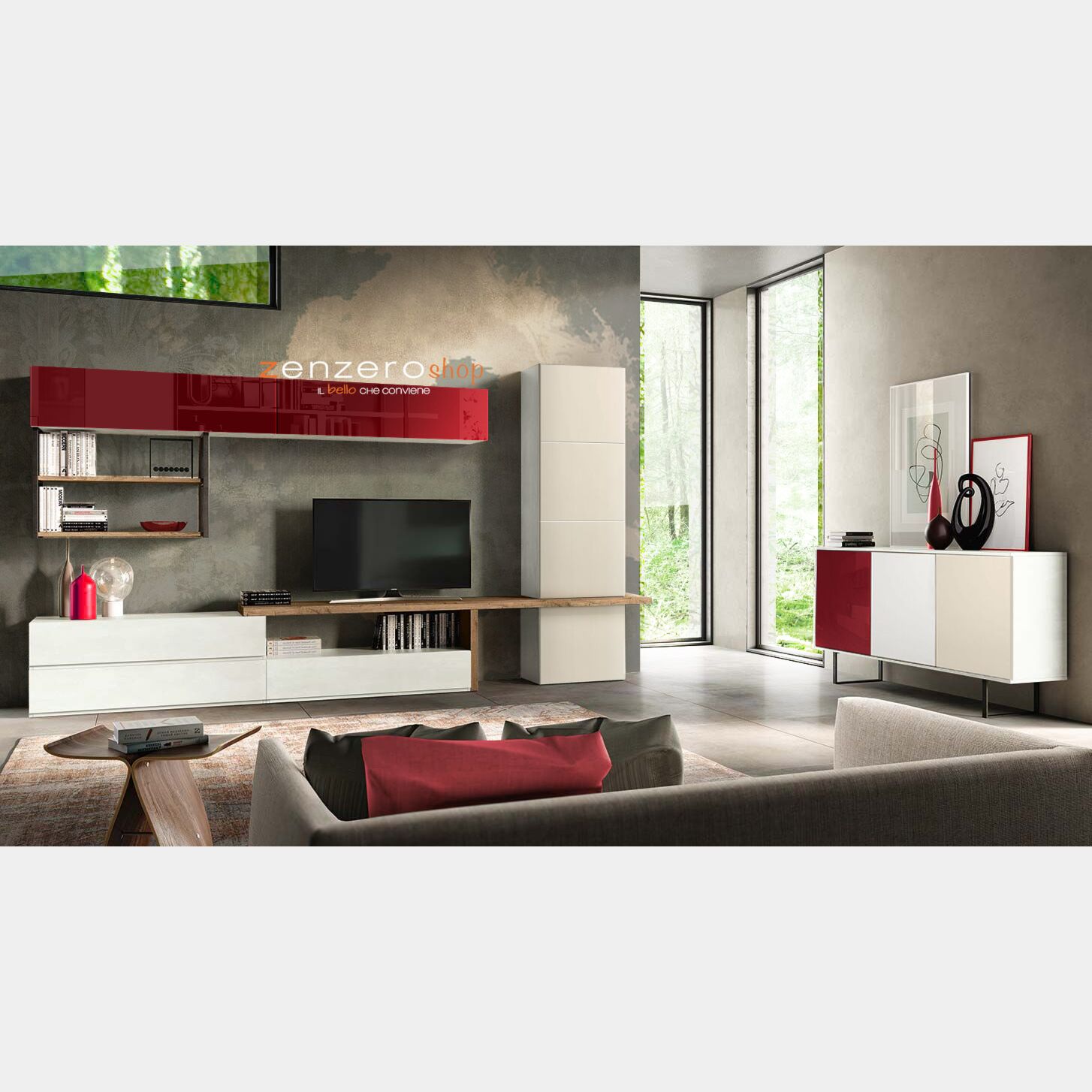 Soggiorno moderno Zenzero, parete attrezzata Arkas in finitura Frassinato bianco, Rovere Nordico, Terra opaco e Vetro Rosso