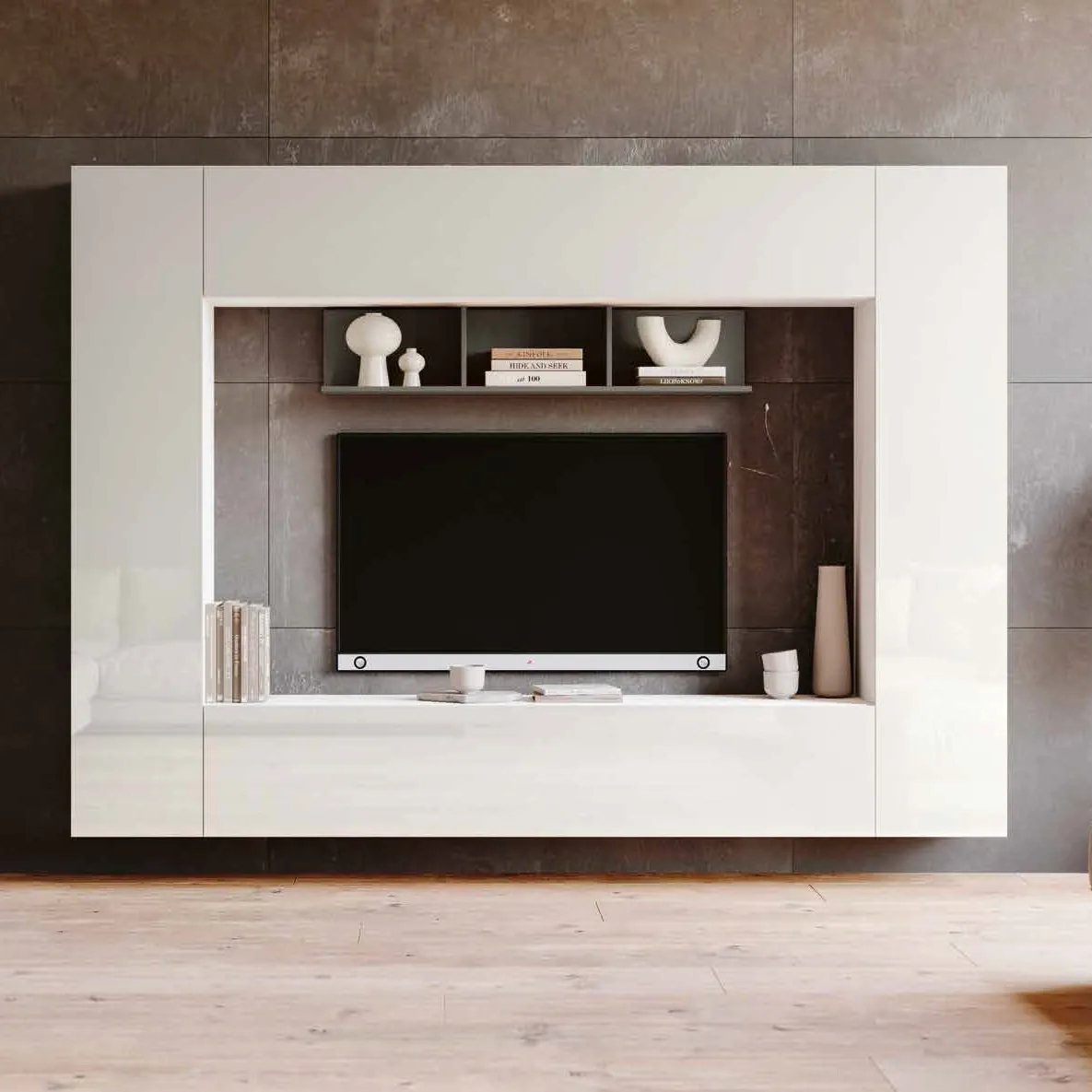 Le linee pulite e i colori neutri si adattano perfettamente a un arredamento contemporaneo. La modularità della parete permette di creare una composizione unica e adatta alle proprie esigenze.