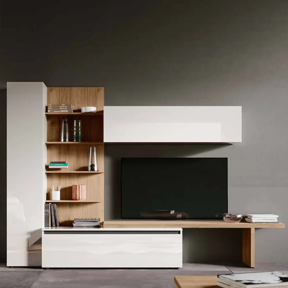 La parete presentra due finiture: il noce biondo e il bianco nobilitato/laccato. Tramite configuratore puoi personalizzare la parete, adattandola al tuo soggiorno. Scopri tutta la collezione Easy!