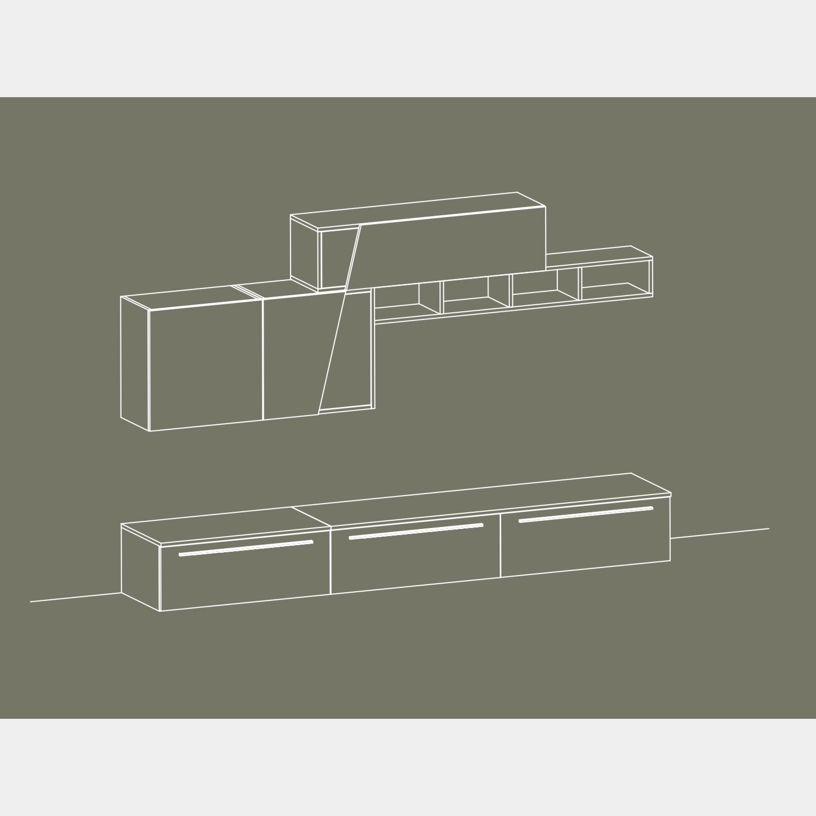 La parete ha struttura in finitura Bianco frassino, frontali elementi sospesi in finitura Cemento. Libreria orizzontale in finitura Fango.