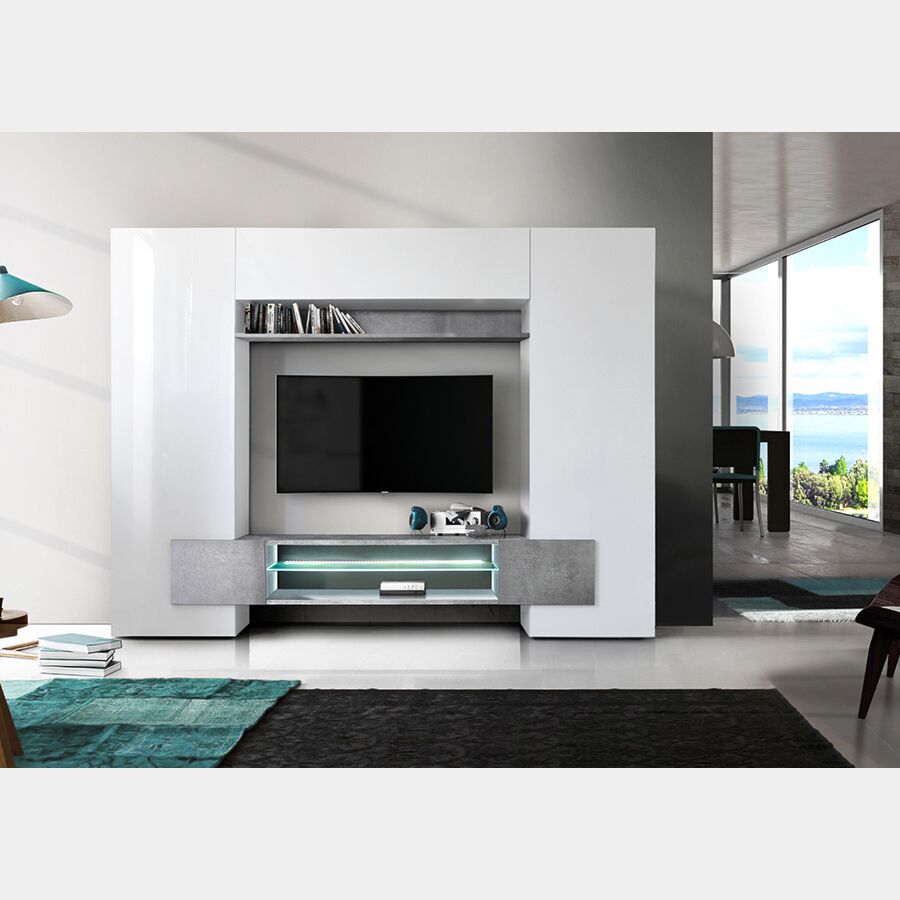 La scocca principale con ante laterali e pensile sono bianche lucide mentre la base TV e mensola sono in finitura Beton.