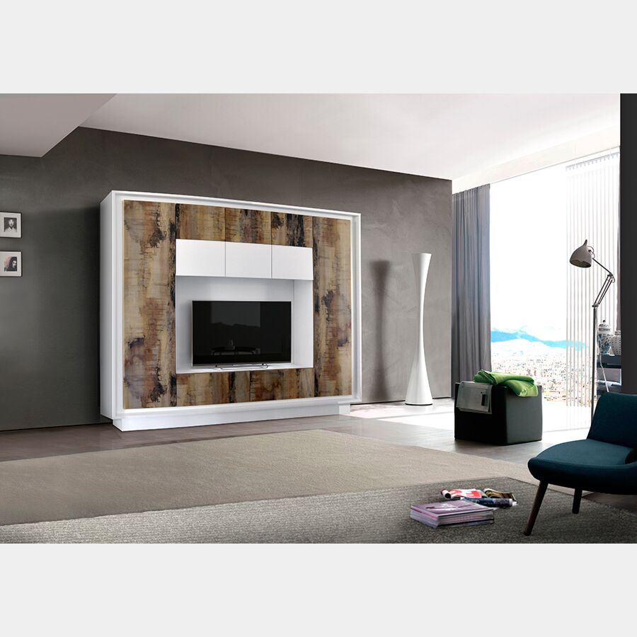 Nella parete è possibile appoggiare la TV o appenderla alla schiena. La parete è dotata di fori passacavi. Misure vano tv: L.132 H.85 P.33 cm