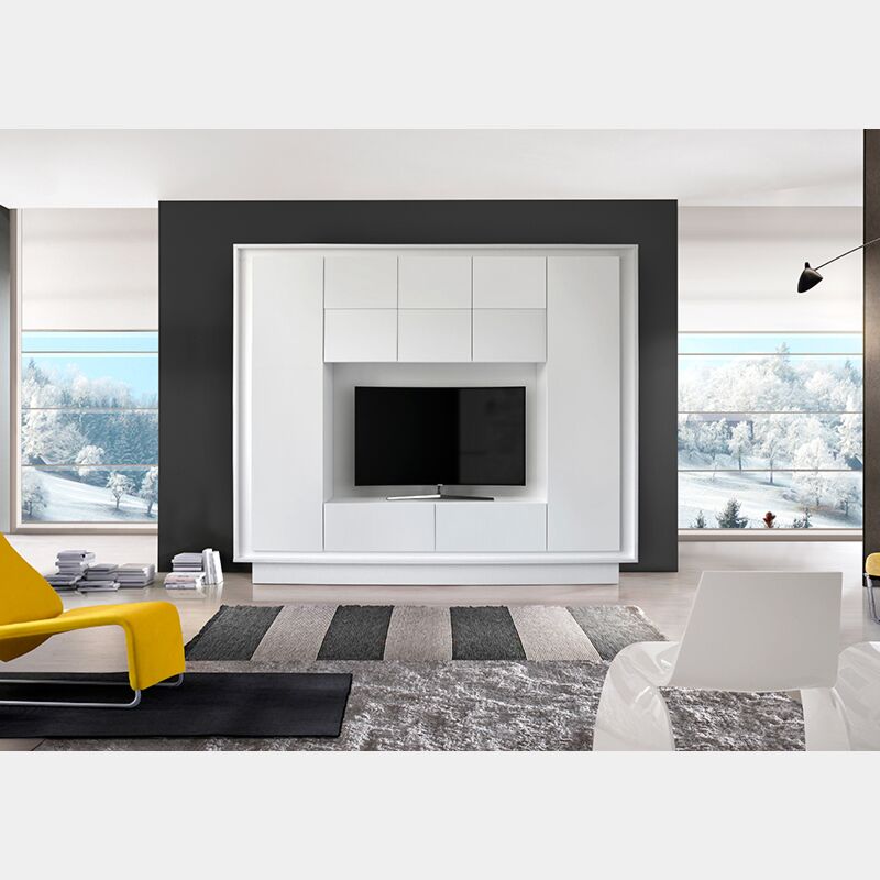 Soggiorno a due cassetti e otto ante. Design moderno e linee squadrate e pulite. La parete attrezzata si presenza nella finitura bianco opaco con cornice bianco opaca e frontali bianco opaco.