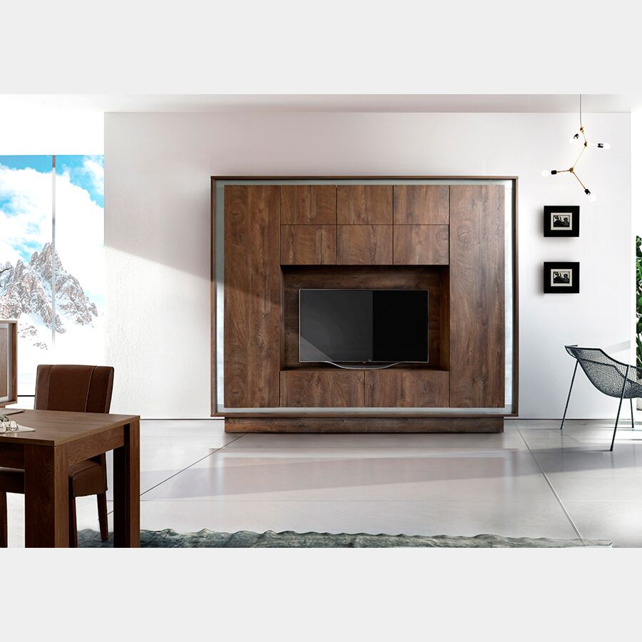 Soggiorno a due cassetti e otto ante. Design moderno e linee squadrate e pulite. La parete attrezzata si presenza nella finitura cognac con cornice in metallo e frontali cognac. Nella parete è possibile appoggiare la TV o appenderla alla schiena con fori passacavi.
