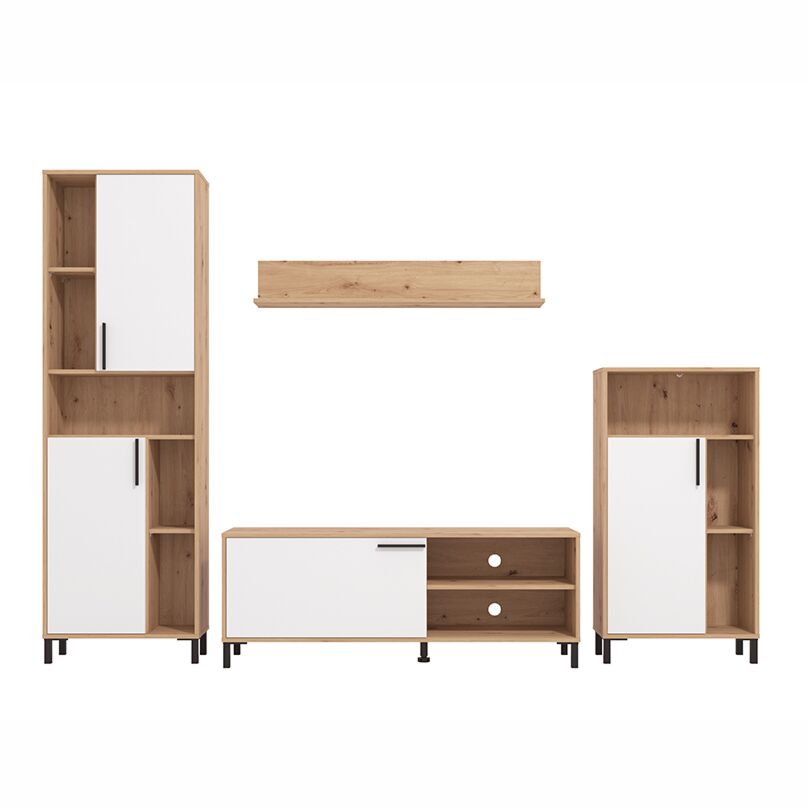 Parete attrezzata componibile con piedini, finitura Bianco e Rovere oak