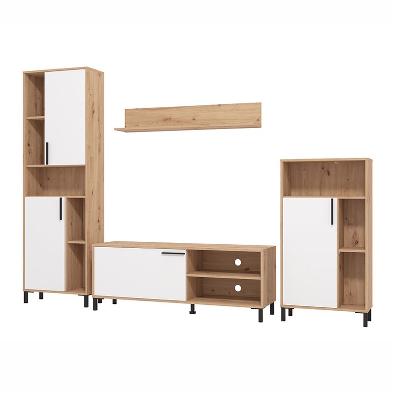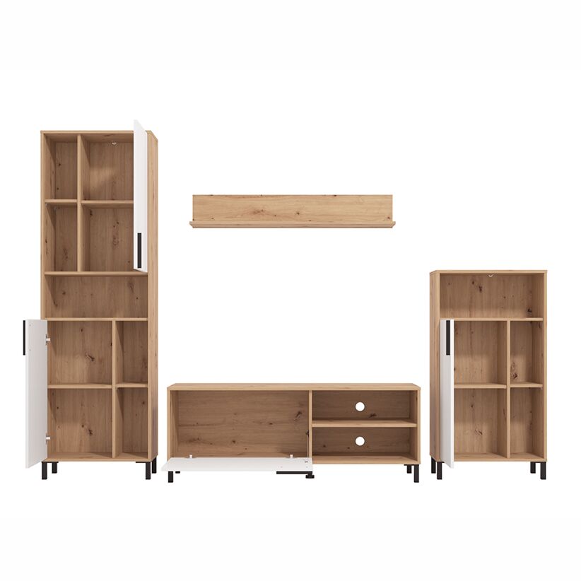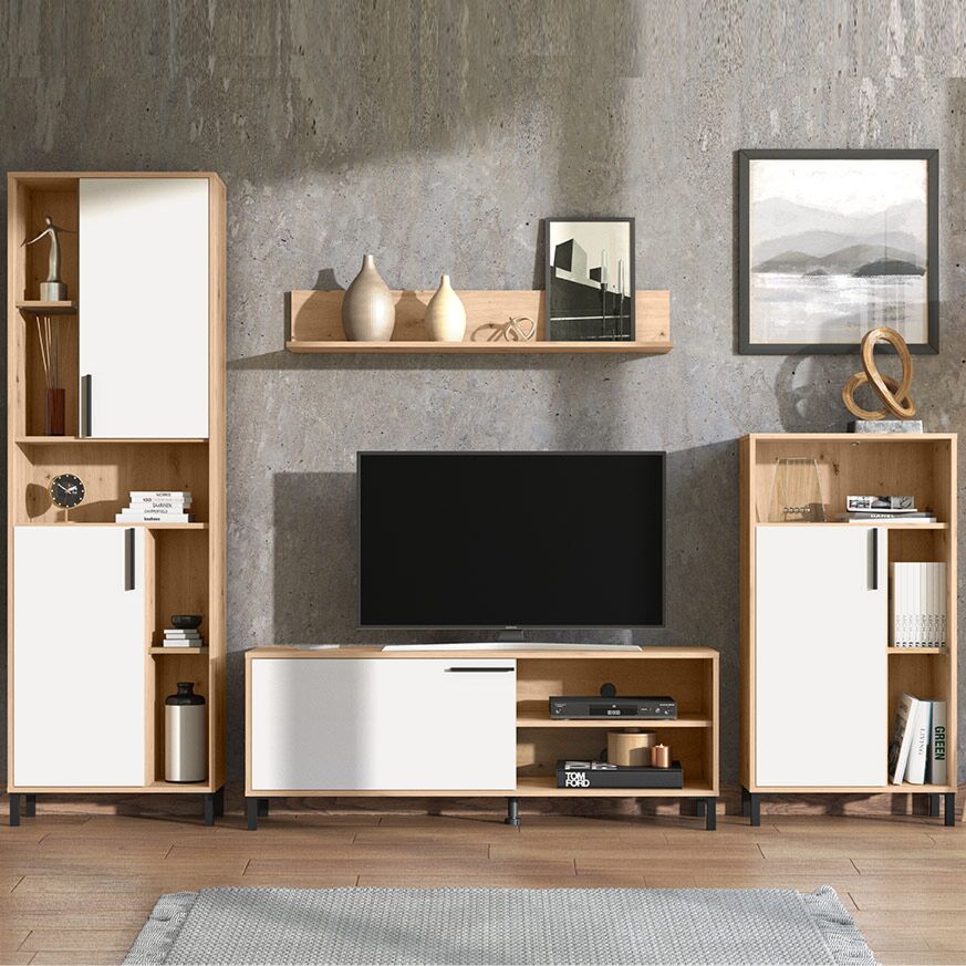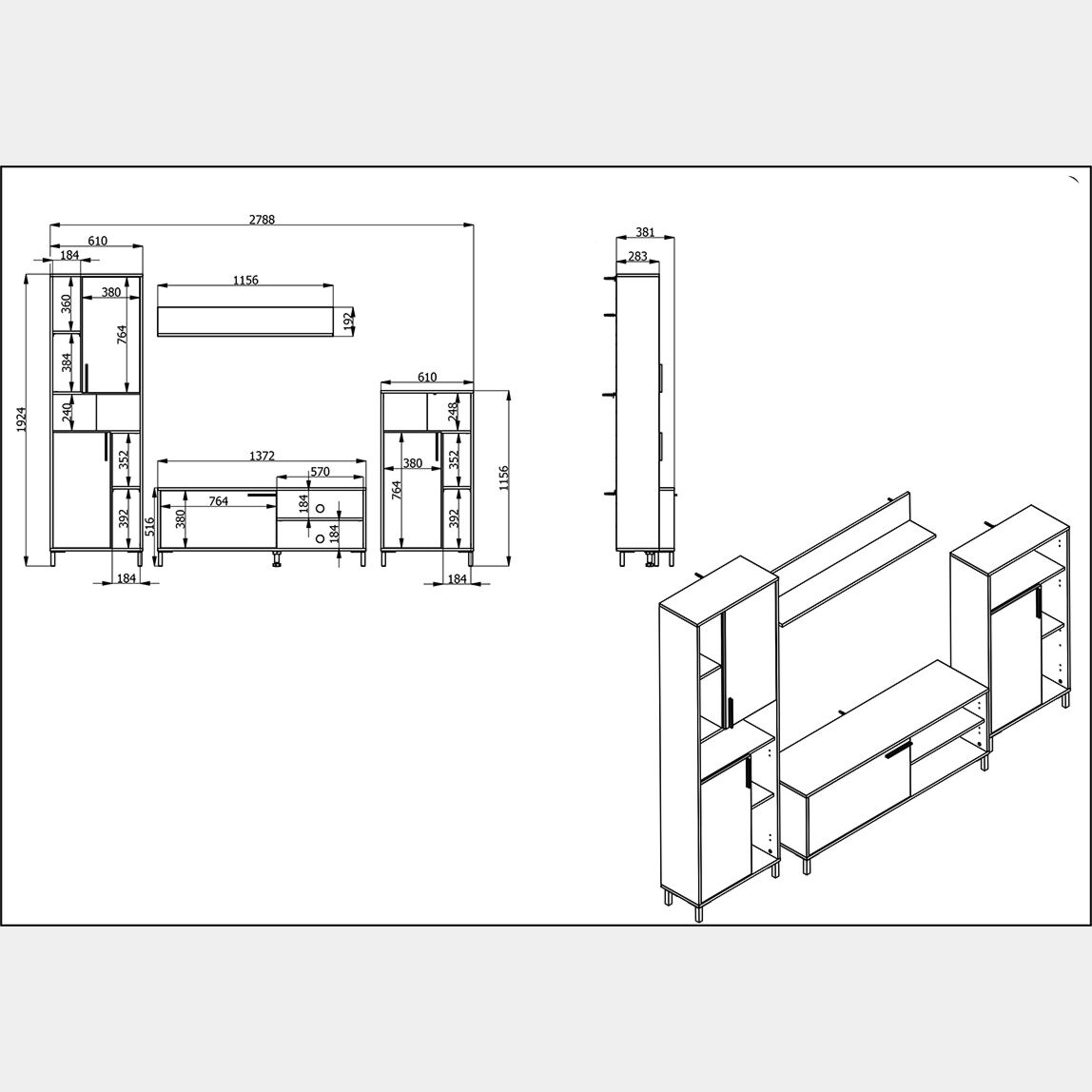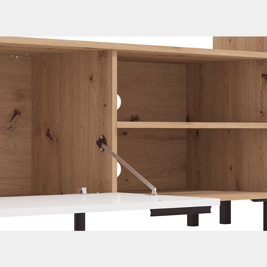 La parete attrezzata è composta da una madia alta dotata di ripiano centrale e vano a giorno superiore, un porta tv con anta a ribalta ripiano a giorno con schienale con foro passacavi, una mensola ed una colonna alta con due ante dotate di ripiano centrale e vano a giorno.