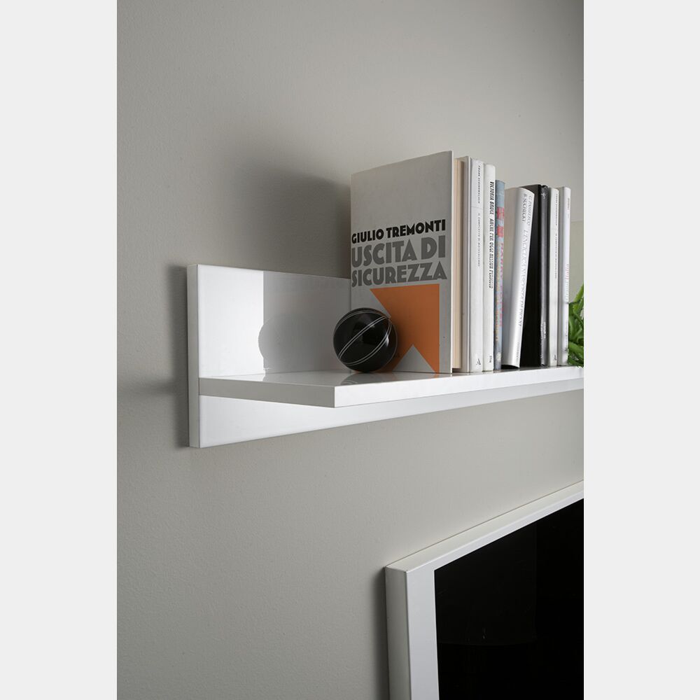 Parete attrezzata con 1 pensile verticale, una ribalta e una mensola in finitura bianco laccato lucido e pero