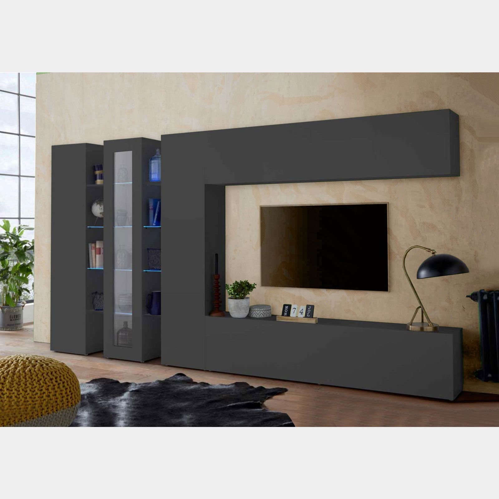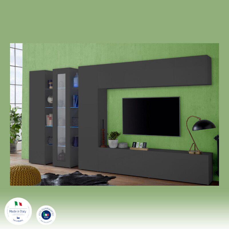 La parete attrezzata finitura Antracite è disponibile in 6 diverse soluzioni pensate per rendere unica la tua zona living.