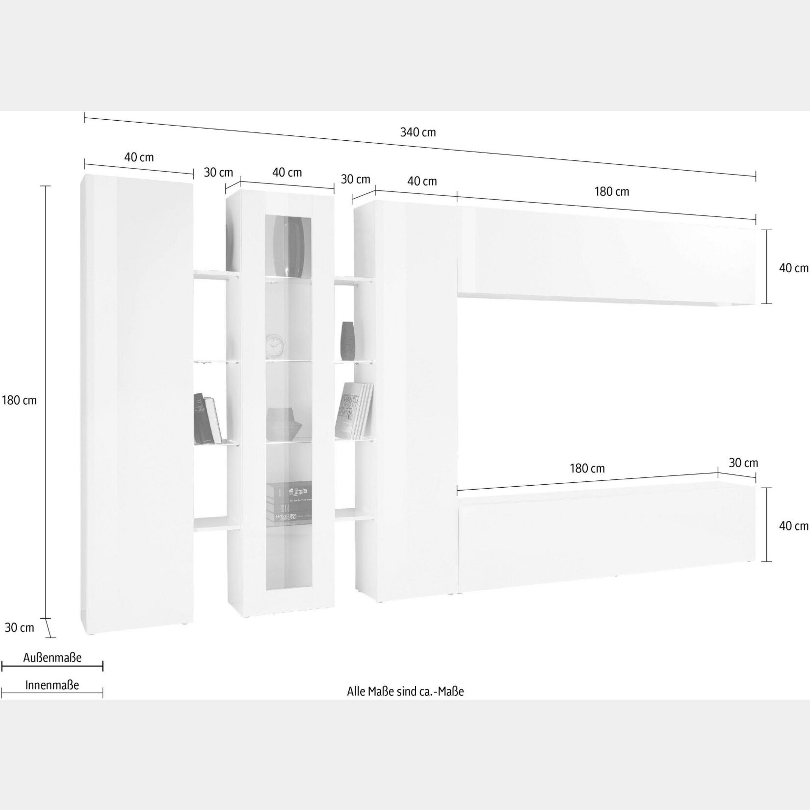 Questa soluzione è composta da 1 vetrina laterale con ripiani in vetro, 2 colonna laterale, 1 base orizzontale con apertura a ribalta e 1 pensile orizzontale.