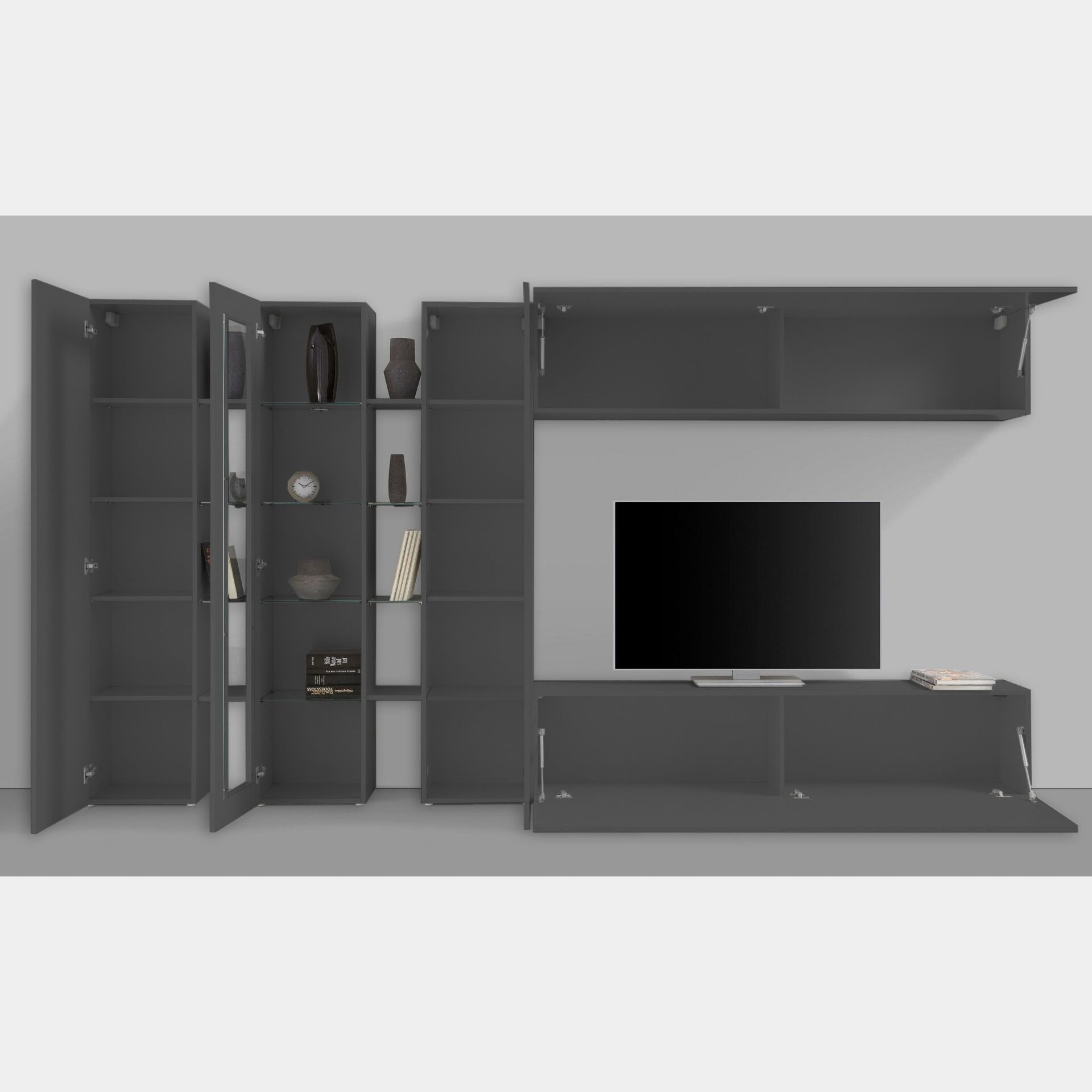 Parete attrezzata con 1 vetrina, 2 colonne e 2 pensili orizzontali, finitura Antracite lucido