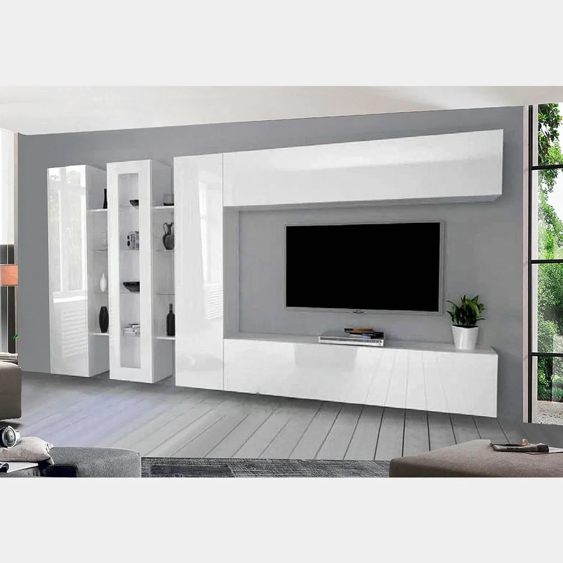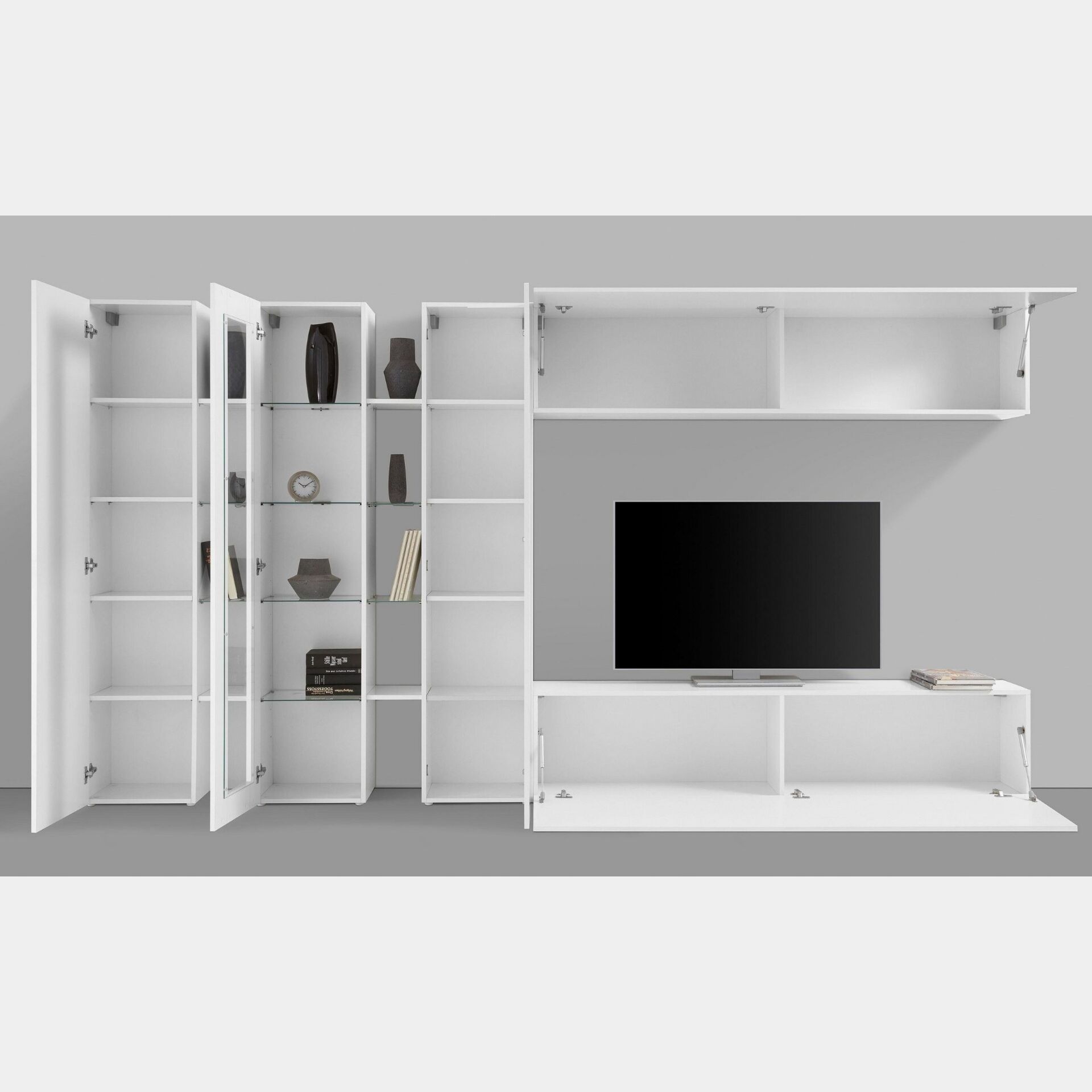 Parete attrezzata con 1 vetrina, 2 colonne e 2 pensili orizzontali, finitura bianco lucido