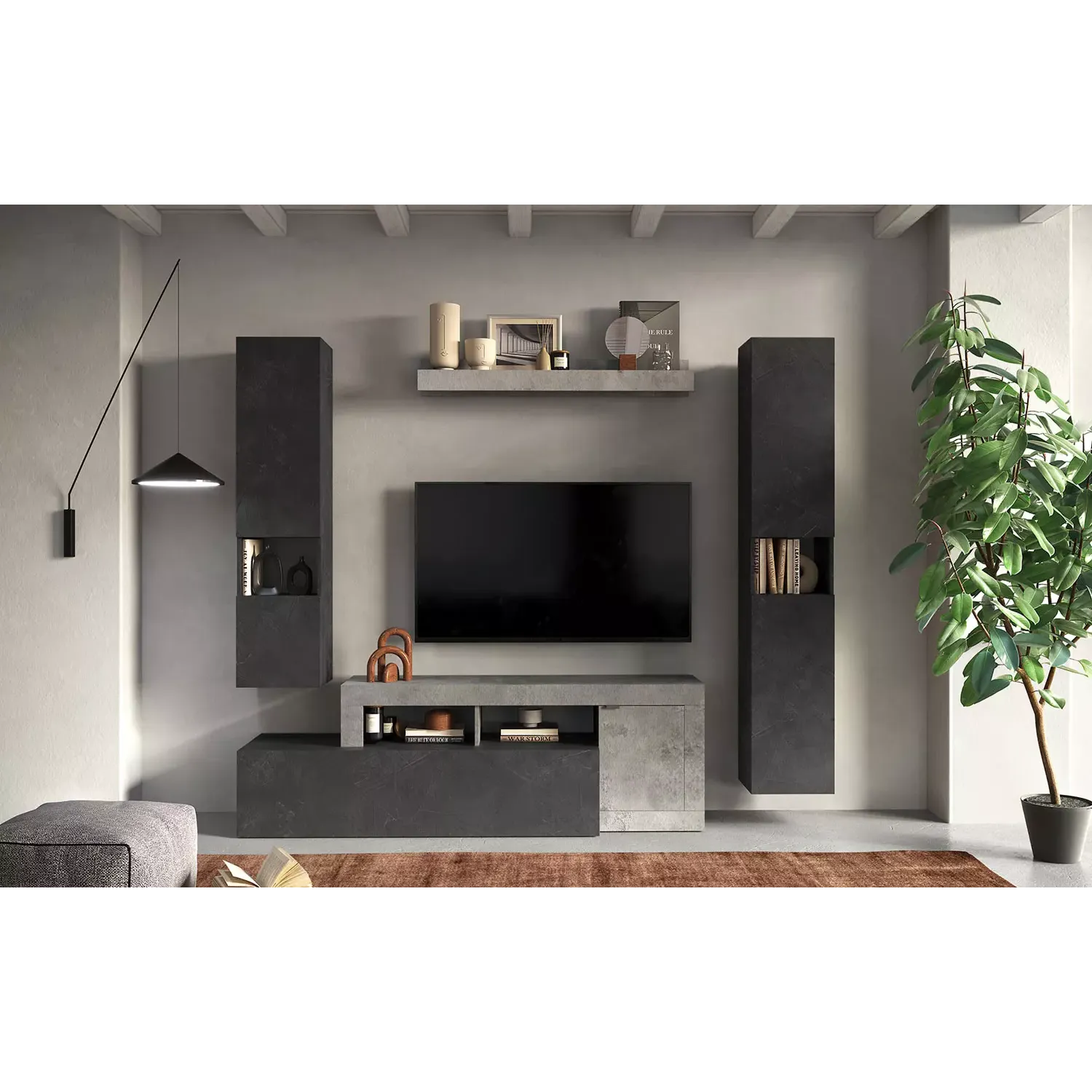 Parete attrezzata con base tv, colonne e mensola, finitura Piombo e Cemento